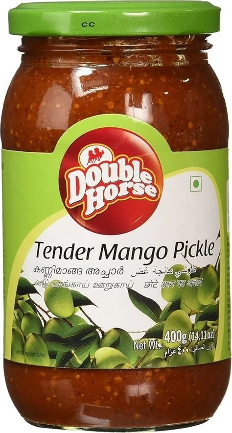 Bring rich, tangy flavor to your table with Double Horse Tender Mango Pickle – 400 g. This traditional South Indian-style pickle uses tender green mango chunks preserved in an aromatic blend of spices and oil. Perfect as a condiment for rice, roti, curries, or even sandwiches .