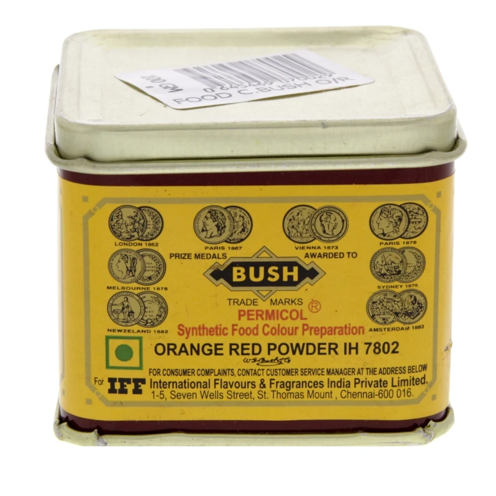 Add vibrant, eye-catching color to your culinary creations with Bush Orange Red Food Colour Powder (100 g). This synthetic, powder-based food coloring in a classic tin is formulated for decorating cakes, icings, desserts, drinks, and snacks. Ideal for bakers who need consistent, bright orange-red hues .
