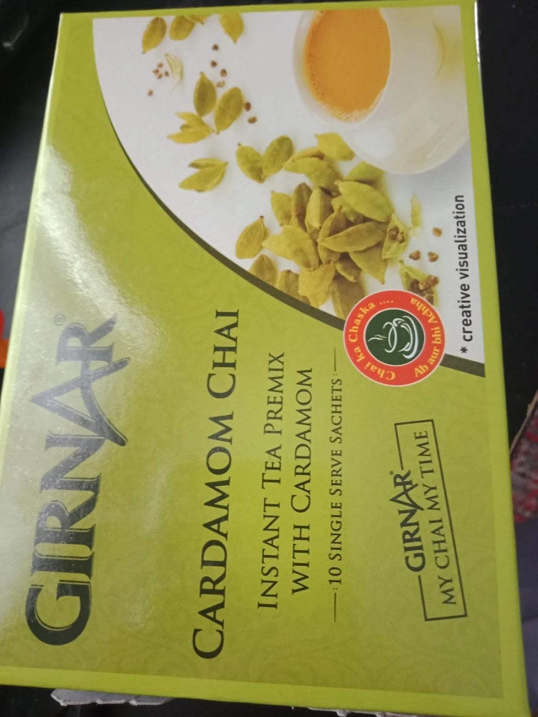 Sugar, Glucose Syrup Solids, Vegetable Oil, Skimmed Milk, Instant Tea Extract, Caseinate, Lactose, Milk Fat, Stabilizers (E340 (ii),E471) & Antioxidant[E306], Cardamom. Contains Milk Manufactured & Packed by Girnar Food & Beverages Pvt. Ltd. 401, Centre Point, Dr. B. Ambedkar Marg, Parel, Mumbai 400012, INDIA At: Girnar Complex, Plot No. 154, G.I.D.C., Umbergaon, Dist. Valsad, Gujarat - 396 171,India LIC No.: 10014021001394 fssat FSSL:-10013022002437