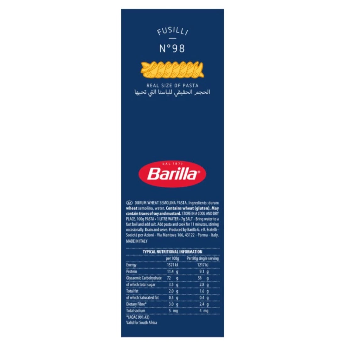 Barilla Fusilli is a spiral-shaped pasta made from 100% durum wheat, offering a firm, al dente texture. This 500g pack is perfect for capturing sauces, whether hearty or light. Cooks in just 8-10 minutes, making it a versatile choice for family meals, pasta salads, or baked dishes. Enjoy authentic Italian flavor with every twist!