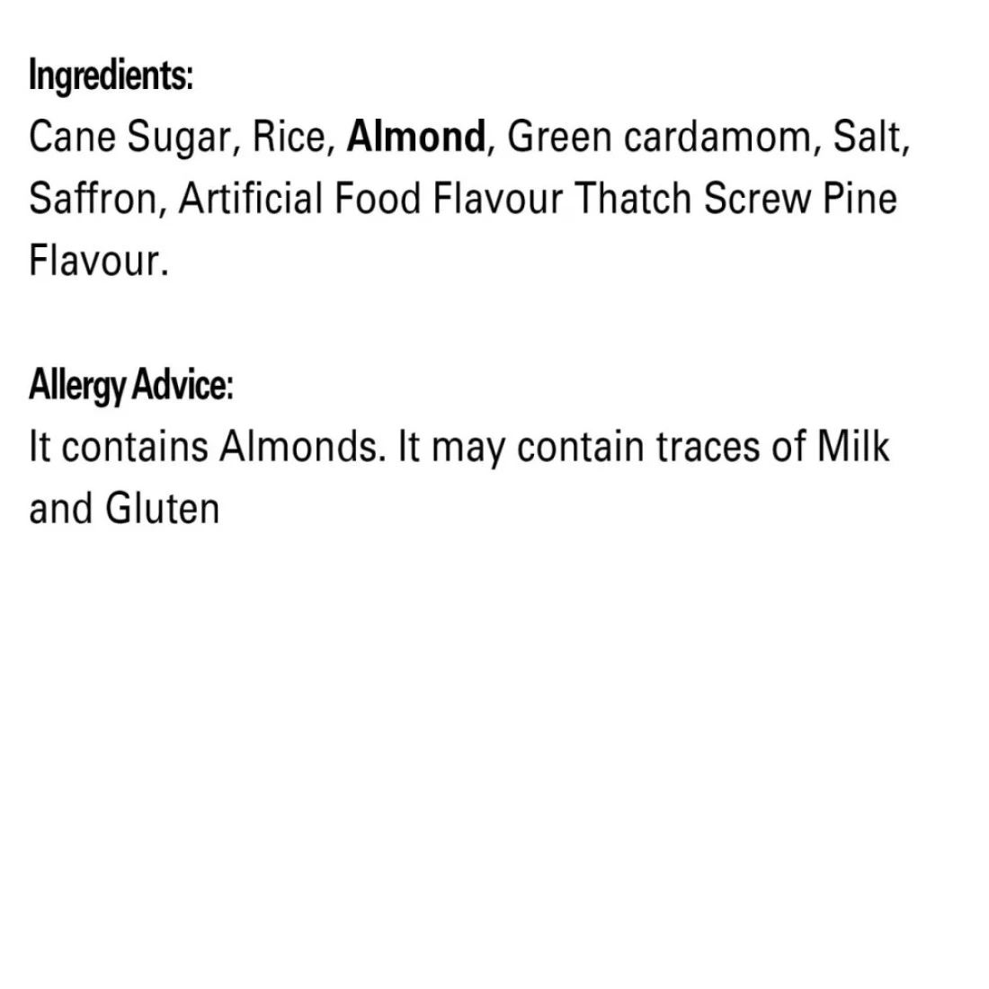 ingredients : Sugar, Rice, Almond, (Tree Nuts) Artificial Food Flavours, Salt, Green, Cardamom, Saffron