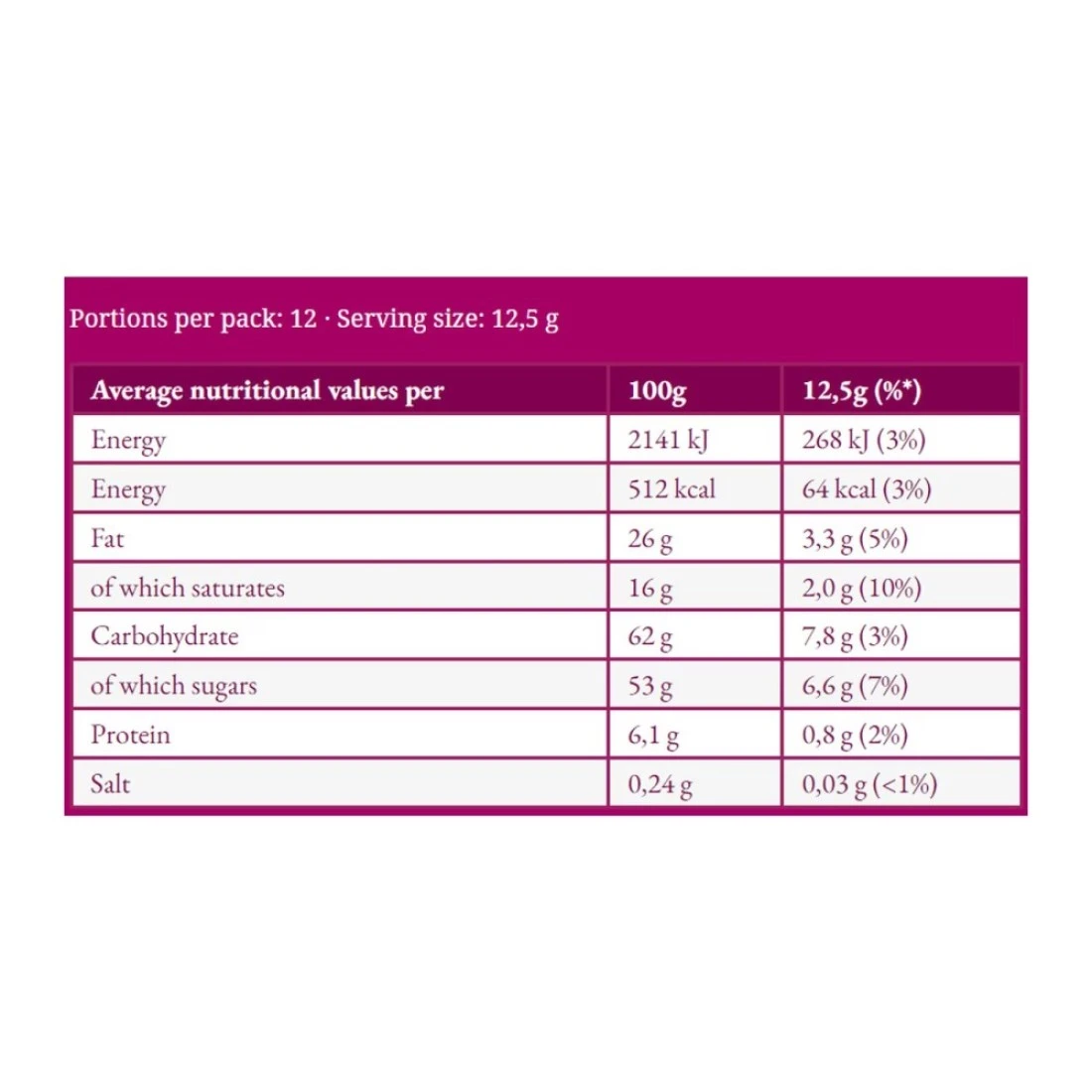 ingredients : Sugar, Palm Kernel Fat*, Wheat Flour, Skimmed Milk Powder (from Cow´s Milk), Hazelnut Paste (7%), Cocoa Butter, Cocoa Mass, Whey Powder (from Cow´s Milk), Lactose (from Cow´s Milk), Butterfat (from Cow´s Milk), Fat-reduced Cocoa, Emulsifier (soya Lecithins), Salt