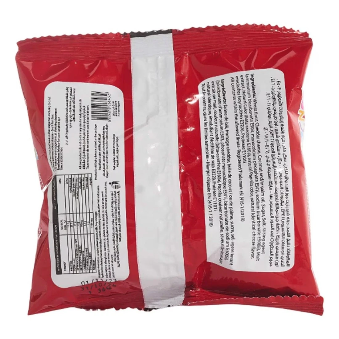 ingredients : Wheat Flour, Cheddar Cheese, Coconut And/Or Palm Oil, Sugar, Salt, Raising Agent (Ammonium Bicarbonate E503, Monocalcium Phosphate E341, Sodium Bicarbonate E500), Malt Extract, Natural Colour (Beta Carotene E160a), Natural Paprika Colour, Natural Identical Cheese Flavour, Emulsifier (Soy Lecithin E3220), Protease E1101i