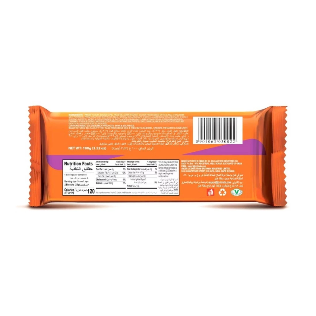 ingredients : Wheat Flour, Sugar (37%), Palm Oil, Corn Starch, Cocoa Processed With Alkali (2.5%), Skim Milk Powder (From Cow’s Or Buffalo’s Milk), Sodium Bicarbonate (e500(ii)) And Ammonium Bicarbonate (e503(ii)) (Raising Agents), Mono And Diglycerides Of Fatty Acids (Palm) (e471) And Soya Lecithin (e322)(Emulsifiers),caramel (e150a And E150d) (Natural Colours) (Contains Sulphites), Salt, Vanilla, Milk And Chocolate (Nature Identical And Artificial Flavours)