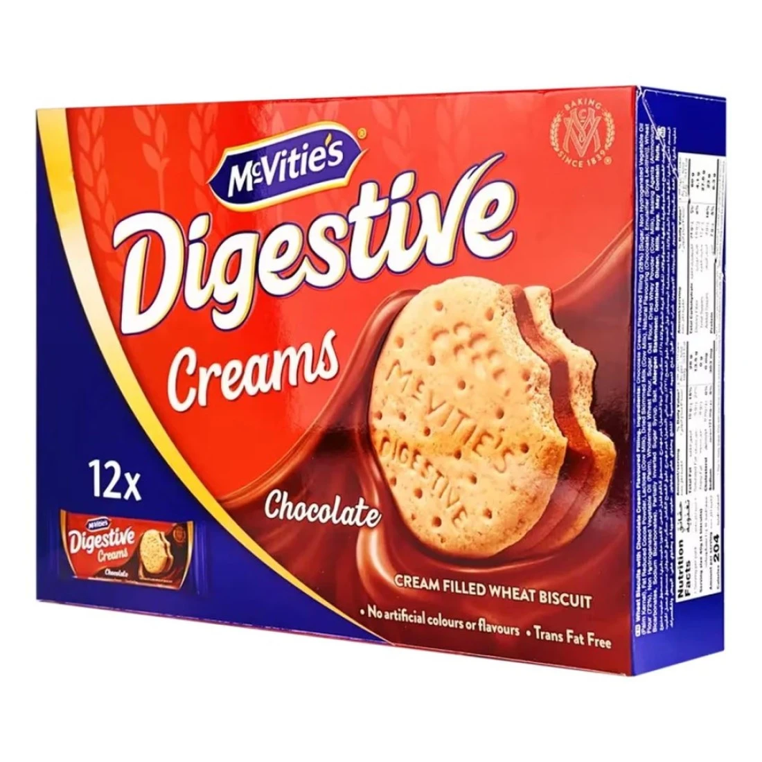 McVitie's Digestive Creams Chocolate Cream Filled Wheat Biscuits are a delicious treat that combines the classic taste of digestive biscuits with a creamy chocolate filling. Each biscuit is made with wholesome wheat and filled with a rich chocolate cream, making them the perfect snack for any time of day. This pack contains 12 individual 40g biscuits, making it convenient for on-the-go snacking or sharing with friends and family. Enjoy the satisfying crunch and indulgent chocolate flavour of McVitie's Digestive Creams Chocolate Cream Filled Wheat Biscuits.