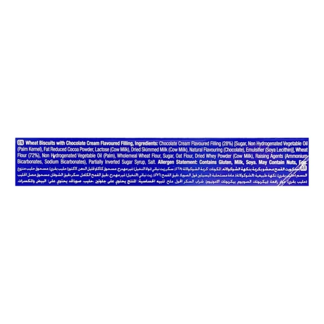 ingredients : Chocolate Cream Flavoured Filling (28%) [Sugar, Non Hydrogenated Vegetable Oil (Palm Kernel), Fat Reduced Cocoa Powder, Lactose (Cow Milk), Dried Skimmed Milk (Cow Milk), Natural Flavouring (Chocolate), Emulsifier (Soya Lecithin)], Wheat Flour (72%), Non Hydrogenated Vegetable Oil (Palm), Wholemeal Wheat Flour, Sugar, Oat Flour, Dried Whey Powder (Cow Milk), Raising Agents (Ammonium Bicarbonates, Sodium Bicarbonates), Partially Inverted Sugar Syrup, Salt