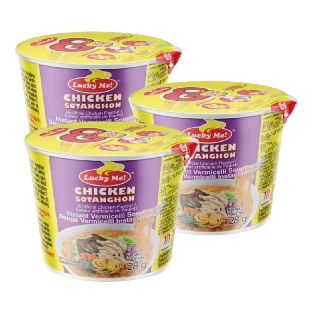 Lucky Me! Chicken Sotanghon Instant Vermicelli Soup is a delicious and convenient instant soup that is perfect for a quick and satisfying meal. Made with real chicken flavour and thin vermicelli noodles, this soup is packed with savoury goodness. Each pack contains 28g of soup, making it easy to prepare and enjoy. With a pack of 3, you can have a comforting bowl of chicken sotanghon soup anytime you want.