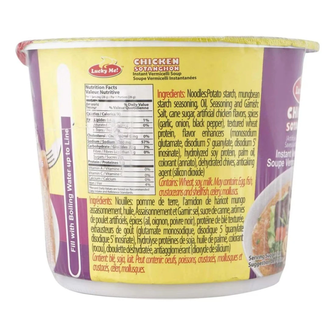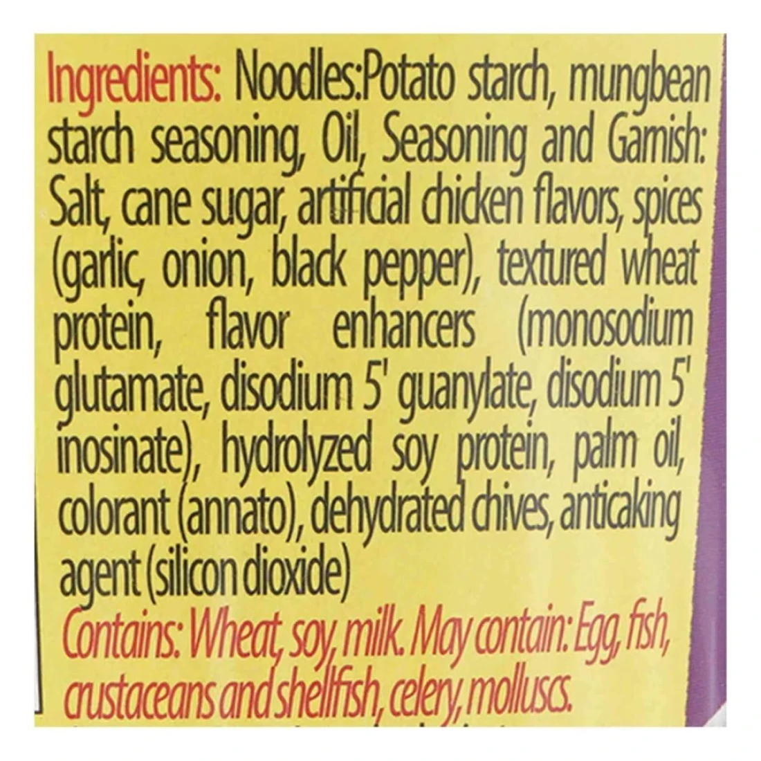 ingredients : Noodles: Potato Starch, Mungbean Starch. Seasoning, Oil, Garnish: Salt, Cane Sugar, Artificial Chicken Flavours, Spices (Garlic, Onion, Black Pepper), Textured Wheat Protein, Flavour Enhancers (Monosodium Glutamate, Disodium 5'guanylate, Disodium 5' Inosinate), Hydrolyzed Soy Protein, Palm Oil, Colorant (Annato), Dehydrated Chives, Anticaking Agent (Silicon Dioxide)