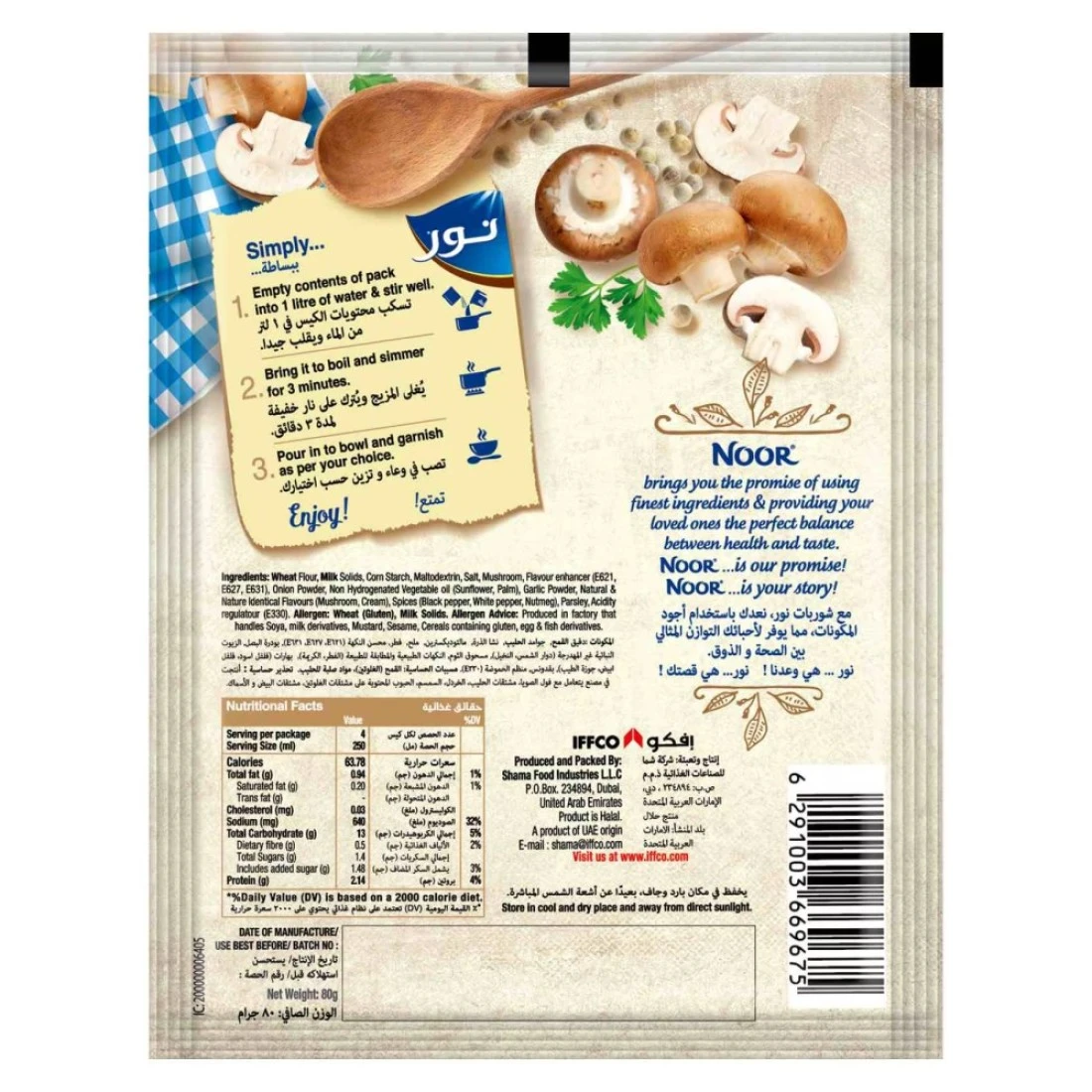 Noor Creamy Mushroom Soup 80g is a delicious and convenient instant soup mix. Made with real mushrooms, it has a rich and creamy texture that is perfect for a comforting meal. Just add hot water and enjoy the savoury and flavourful taste of this soup in minutes. It is a great option for a quick and easy meal or snack.