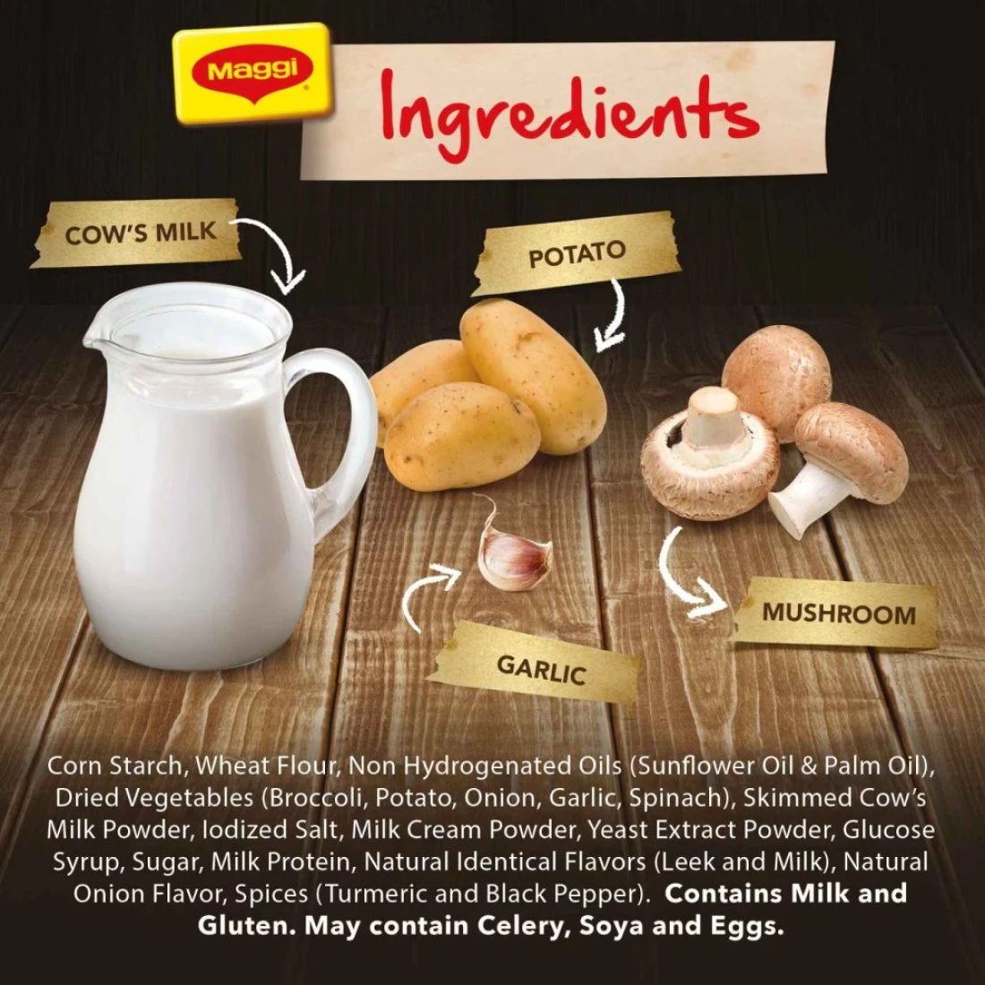 ingredients : Corn Starch, Wheat Flour, Non Hydrogenated Oils (Sunflower Oil and Palm Oil), Dried Vegetables (Broccoli, Potato, Onion, Garlic, Spinach), Skimmed Cow's Milk Powder, Iodized Salt, Milk Cream Powder, Yeast Extract Powder, Glucose Syrup, Sugar, Milk Protein, Natural Identical Flavours (Leek And Milk), Natural Onion Flavour, Spices (Turmeric And Black Pepper)