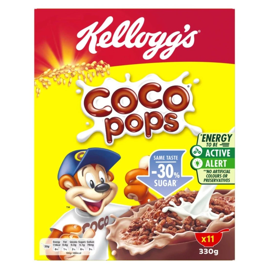 Kellogg's Coco Pops Breakfast Cereal is a delicious and popular choice for breakfast. Made with crispy chocolate-flavoured rice puffs, it is loved by both kids and adults. This 330g pack is perfect for enjoying a bowl of Coco Pops with milk or as a crunchy snack on its own. It provides a tasty and convenient way to start your day with a burst of chocolatey flavour.