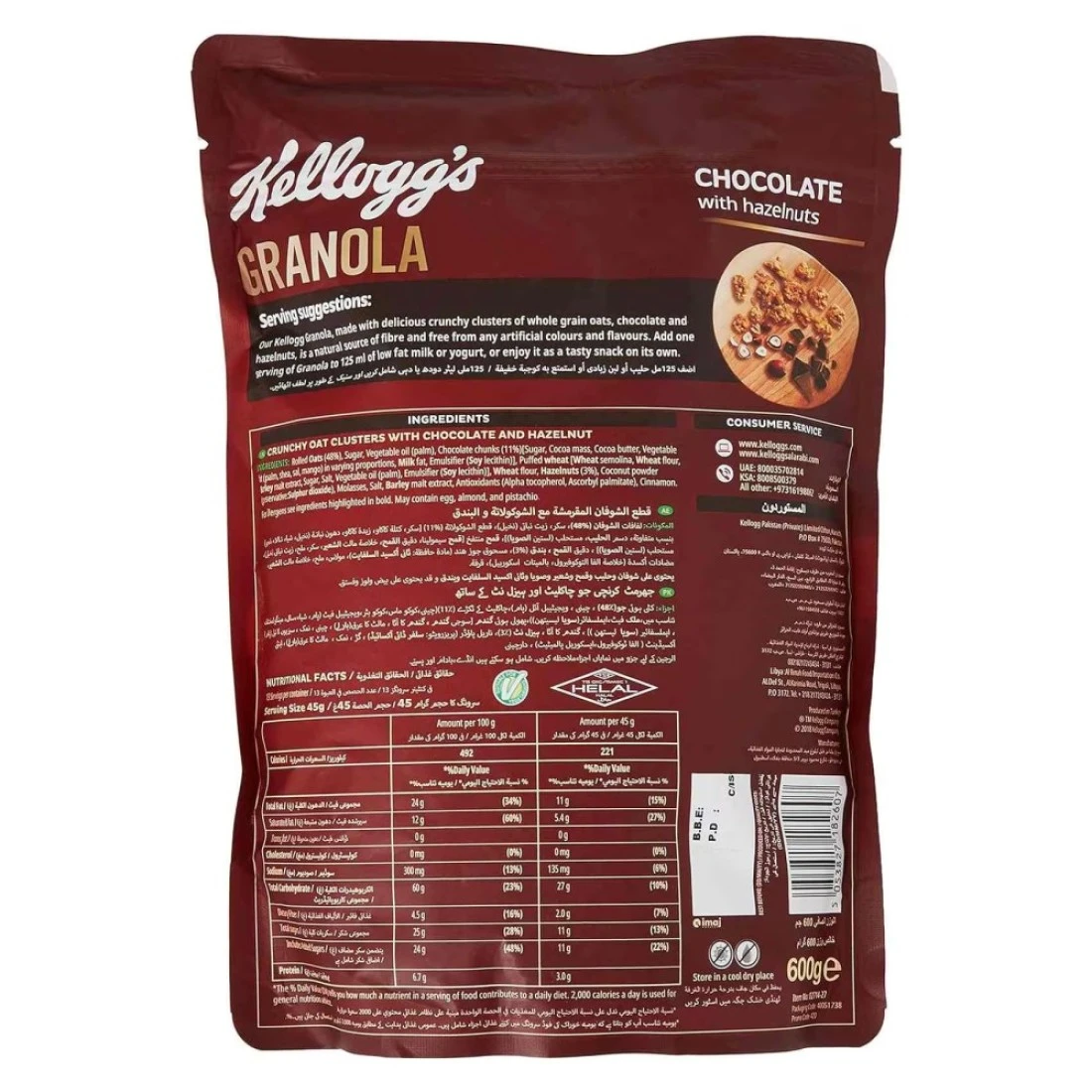 Kellogg's Granola Chocolate with Hazelnuts is a delicious and indulgent breakfast cereal option. Made with whole grain oats, real chocolate chunks, and crunchy hazelnuts, it provides a satisfying and flavourful start to the day. This 600g pack is perfect for those who enjoy the combination of chocolate and nuts in their breakfast routine.
