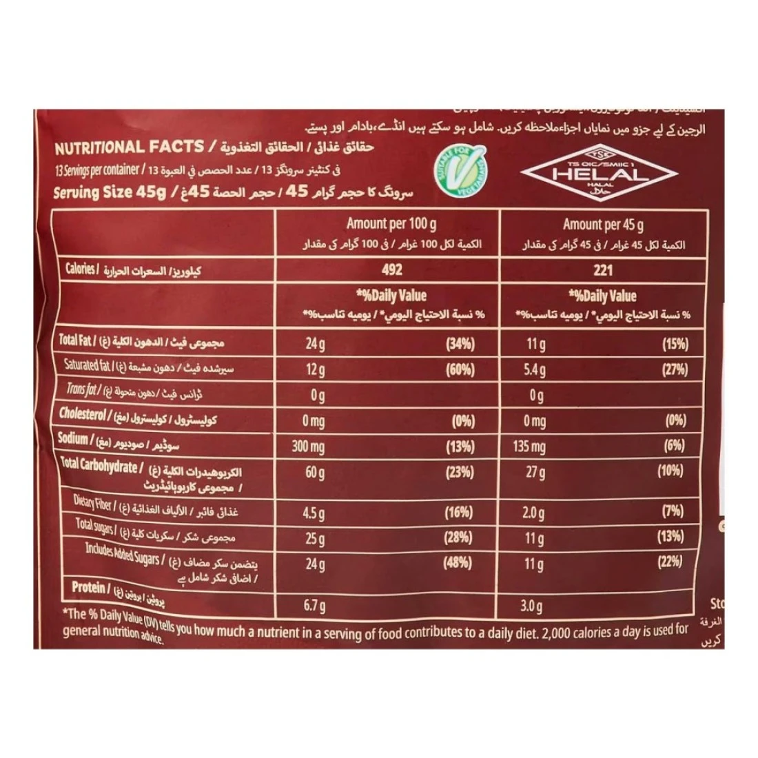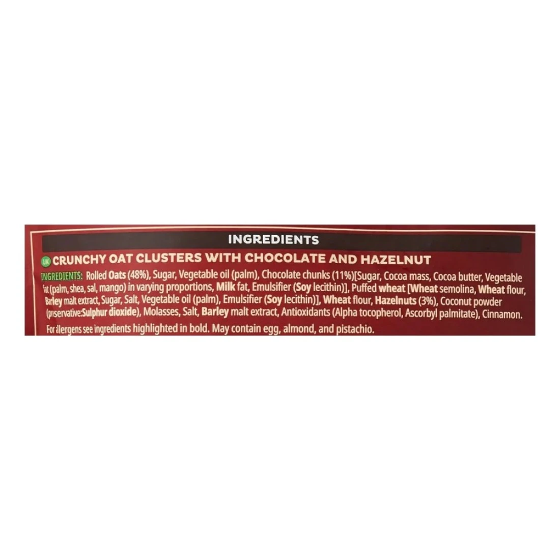 ingredients : Rolled Oats (48%), Sugar, Vegetable Oil (Palm), Chocolate Chunks (11%) [Sugar, Cocoa Mass, Cocoa Butter, Vegetable Fat (Palm, Shea, Sal, Mango) In Varying Proportions, Milk Fat, Emulsifier (Soy Lecithin)], Puffed Wheat [Wheat Semolina, Wheat Flour, Barley Malt Extract, Sugar, Salt, Vegetable Oil (Palm), Emulsifier (Soy Lecithin)], Wheat Flour, Hazelnuts (3%), Coconut Powder (Preservative: Sulphur Dioxide), Molasses, Salt, Barley Malt Extract, Antioxidants (Alpha Tocopherol, Ascorbyl Palmitate), Cinnamon