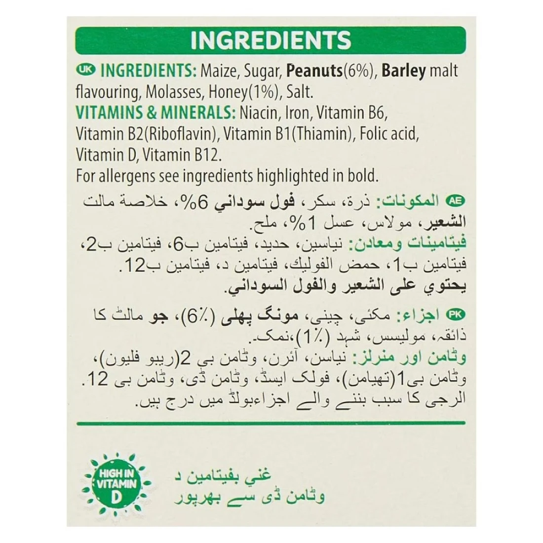 ingredients : Maize, Sugar, Peanuts (6%), Barley Malt Flavouring, Molasses, Honey (1%), Salt. Vitamins & Minerals: Niacin, Iron, Vitamin B6, Vitamin B2 (Riboflavin), Vitamin B1 (Thiamine), Folic Acid, Vitamin D, Vitamin B12