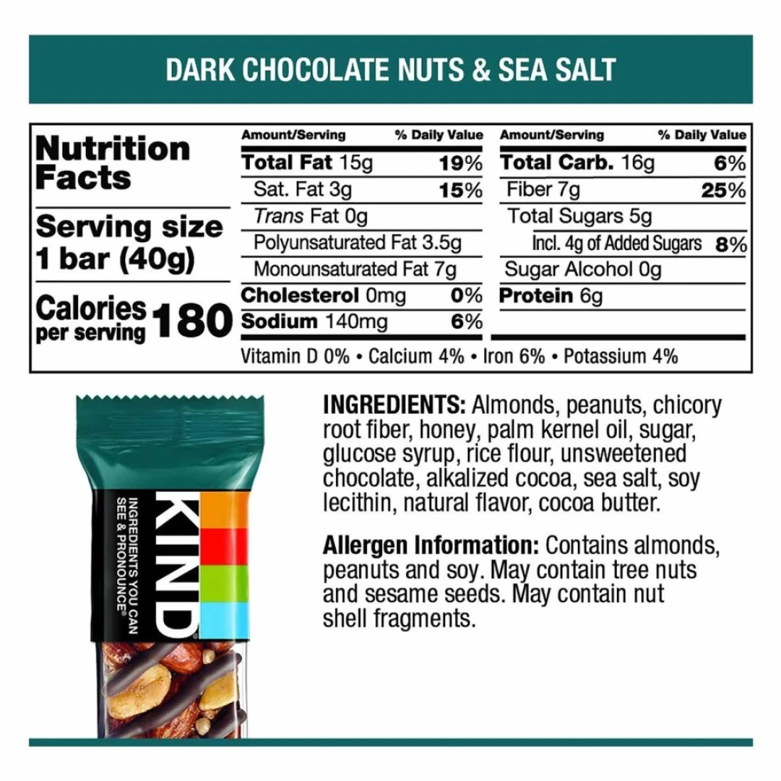 ingredients : Almonds, Peanuts, Dark Chocolate Flavour Coating (Palm Kernel Oil, Chicory Root Fibre, Sugar, Cocoa Powder, Emulsifier (Soy Lecithin), Natural Flavouring, Salt), Chicory Root Fibre, Honey, Glucose Syrup, Rice Flour, Cocoa Mass, Sea Salt, Sugar, Emulsifier (Soy Lecithin), Cocoa Butter, Natural Flavouring