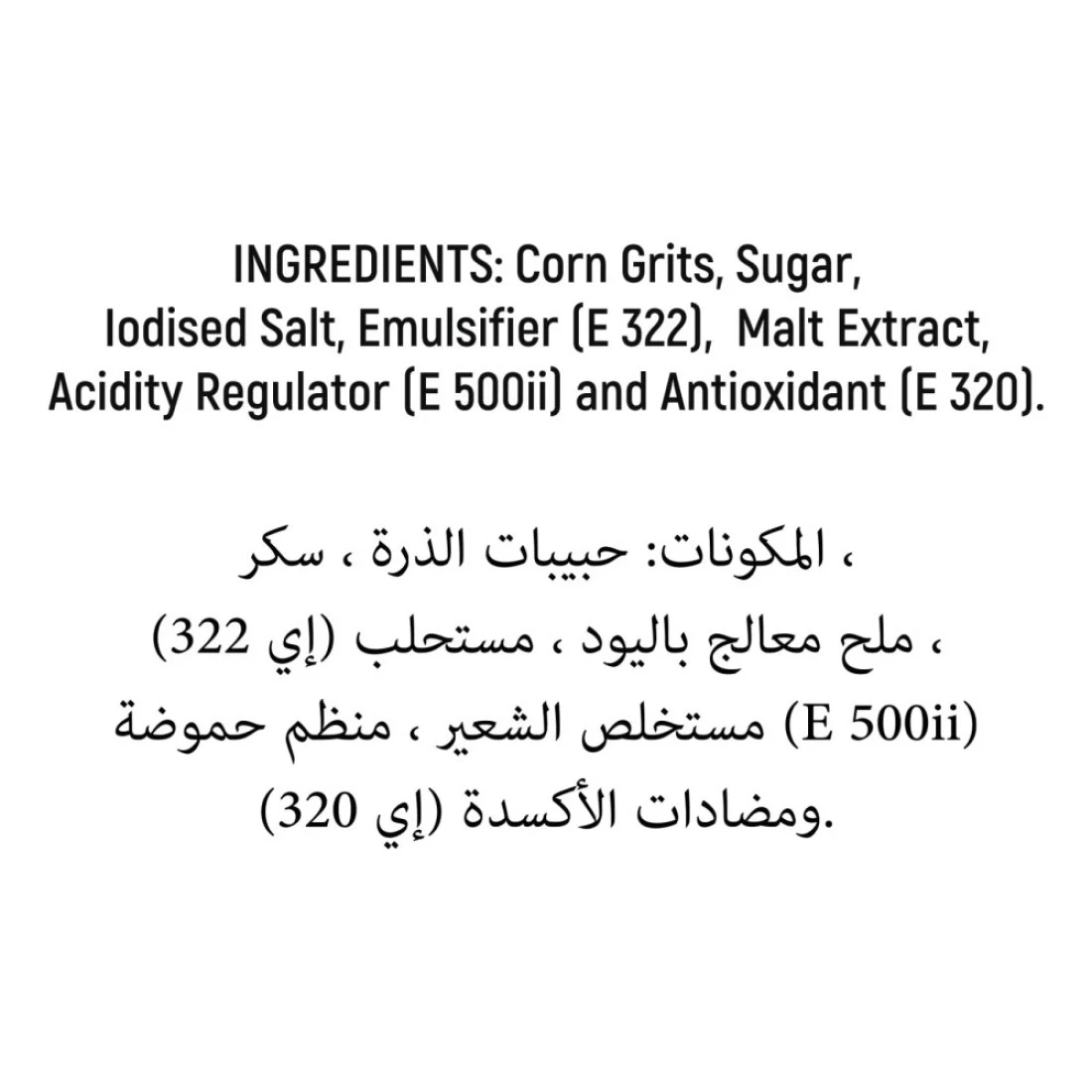ingredients : Milled Corn, Sugar, Malt Flavour, Contains 2% or Less of Salt. Vitamins and Minerals: Iron (Ferric Phosphate), Niacinamide, Vitamin B6 (Pyridoxine Hydrochloride), Vitamin B2 (Riboflavin), Vitamin B1 (Thiamine Hydrochloride), Folic Acid, Vitamin D3, Vitamin B12.
