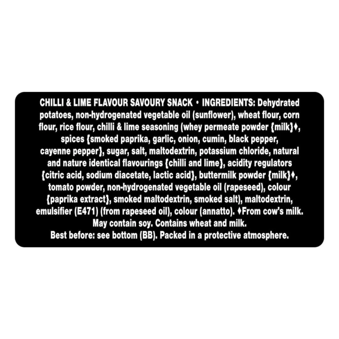 ingredients : Dehydrated Potatoes, Non-hydrogenated Vegetable Oil (Sunflower), Wheat Flour, Corn Flour, Rice Flour, Chilli & Lime Seasoning (Whey Permeate Powder {Milk}, Spices (Smoked Paprika, Garlic, Onion, Cumin, Black Pepper, Cayenne Pepper}, Sugar, Salt, Maltodextrin, Potassium Chloride, Natural And Nature Identical Flavourings {Chilli And Lime}, Acidity Regulators {Citric Acid, Sodium Diacetate, Lactic Acid}, Buttermilk Powder {Milk}, Tomato Powder, Non-hydrogenated Vegetable Oil (Rapeseed), Colour {Paprika Extract}, Smoked Maltodextrin, Smoked Salt), Maltodextrin, Emulsifier (E471) (From Rapeseed Oil), Colour (Annatto). From Cow's Milk