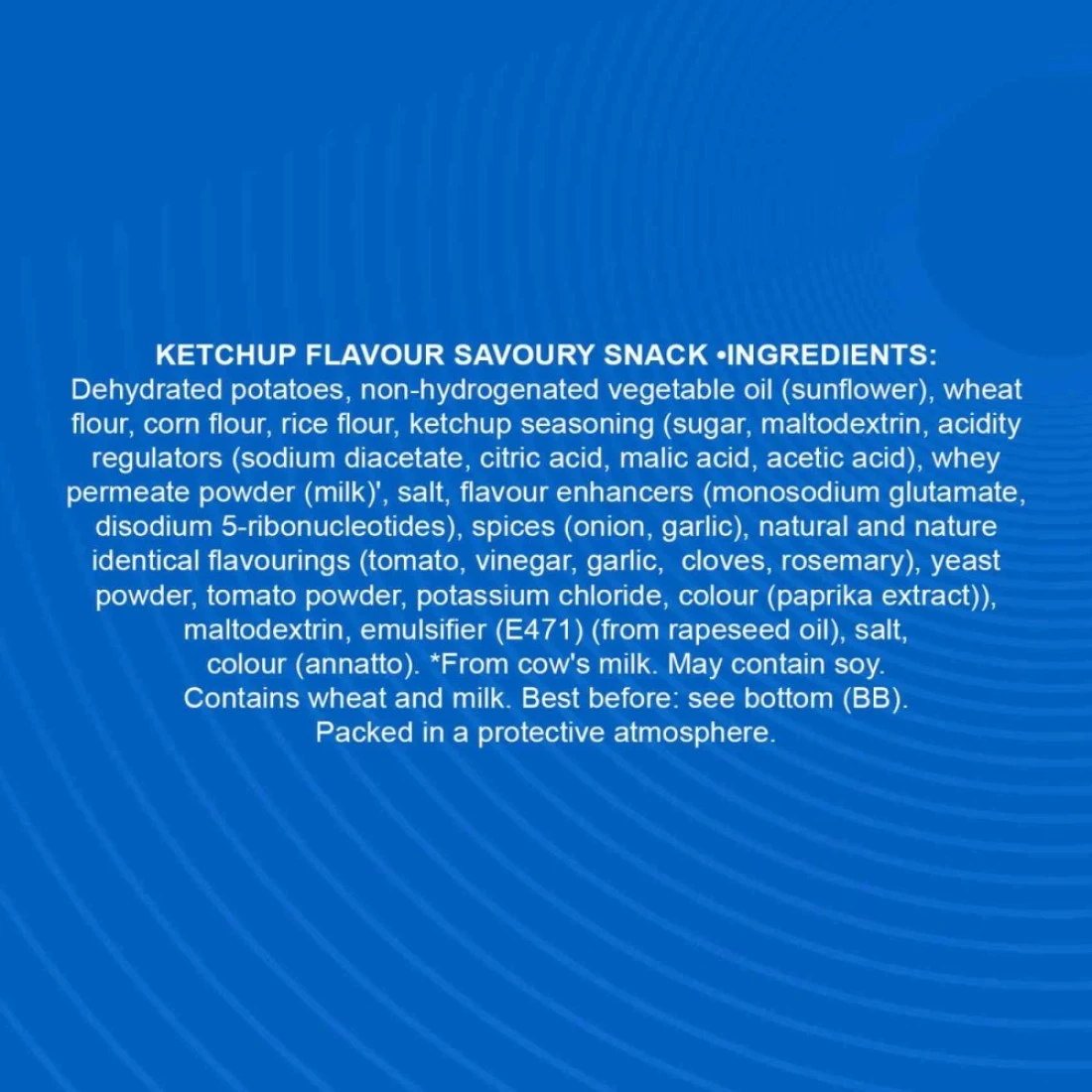 ingredients : Dried Potato, Vegetable Oil (Sunflower, Corn), Rice Flour, Wheat Starch, Corn Flour, Ketchup Flavor (Sugar, Acidity Regulator Sodium Diacetate, Acetic Acid), Flavor Enhancer Mono Sodium Glutamate Natural Flavor (Kernels, Mountain Eucalyptus, Parsley, Garlic, Onion, Emulsifier Monoclonal And Dicloceride Of Fatty Acids (Rapeseed Oil), Natural Flavor (Tomato Powder And Paprika Powder), Maltodextrin, Salt, Natural Color, Annato And Cows Milk.