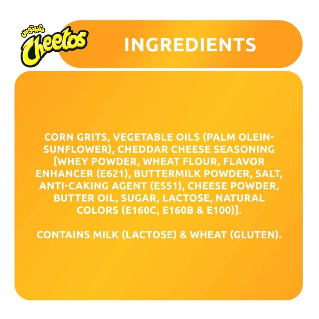 ingredients : Corn Grits, Vegetable Oils (Palm Oleinsunflower), Cheddar Cheese Seasoning [Whey Powder, Wheat Flour, Flavour Enhancer (E621), Buttermilk Powder, Salt, Anti-Caking Agent (E551), Cheese Powder, Butter Oil, Sugar, Lactose, Natural Colours (E160c, E160b And E100)].