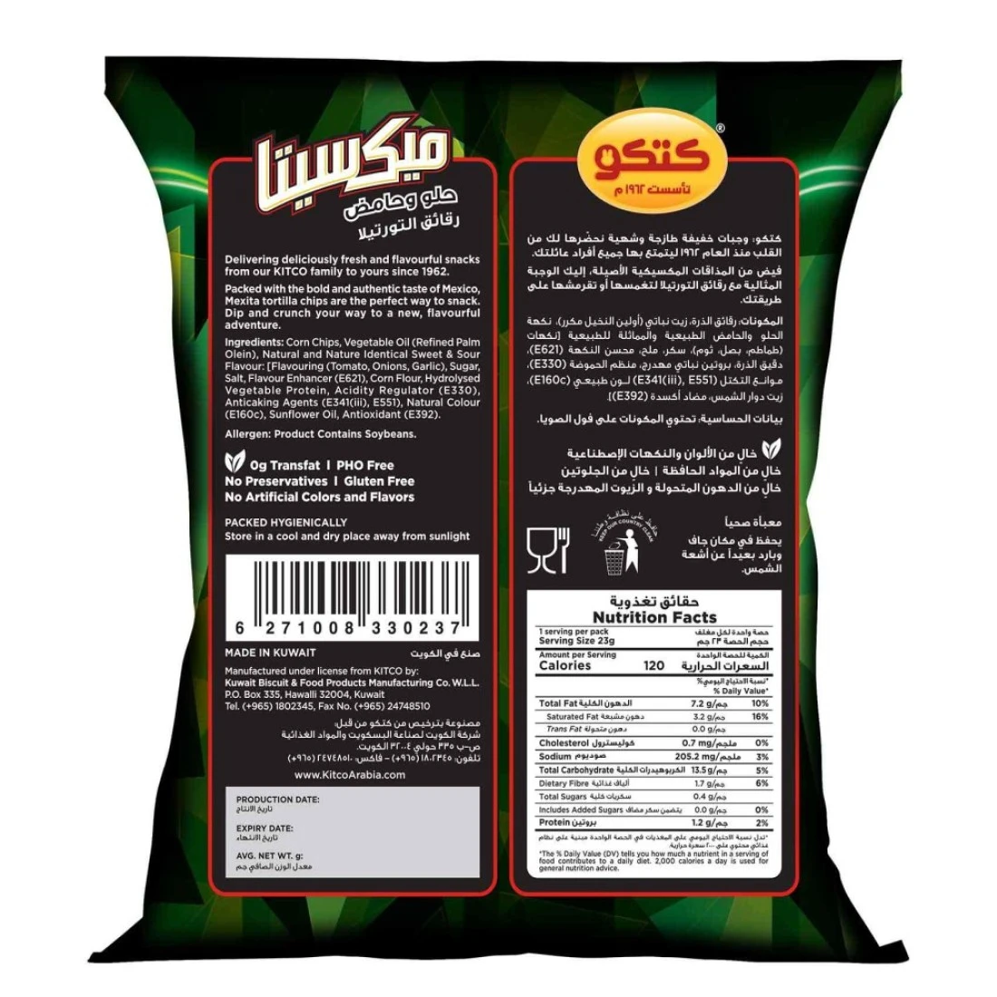 Kitco Mexita Sweet And Sour Tortilla Chips are a savoury and flavourful snack that combines the delicious taste of sweet and sour flavours with a crunchy tortilla chip. Made from high-quality ingredients these chips are seasoned with a perfect blend of spices to create an irresistible taste. The 40g package is perfect for on-the-go snacking or for enjoying as a quick snack at home. Whether you're looking for a tasty snack to satisfy your craving or to share with friends Kitco Mexita Sweet And Sour Tortilla Chips are a great choice.
