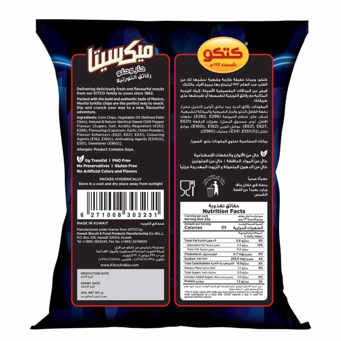 Kitco Mexita Sweet Chilli Pepper Tortilla Chips are a delicious and flavourful snack option. Made with high-quality ingredients these tortilla chips are crispy and have just the right amount of heat from the sweet chilli pepper seasoning. Each 40g bag is perfect for on-the-go snacking or as a side with your favourite dip. Enjoy the bold and zesty taste of Kitco Mexita Sweet Chilli Pepper Tortilla Chips.