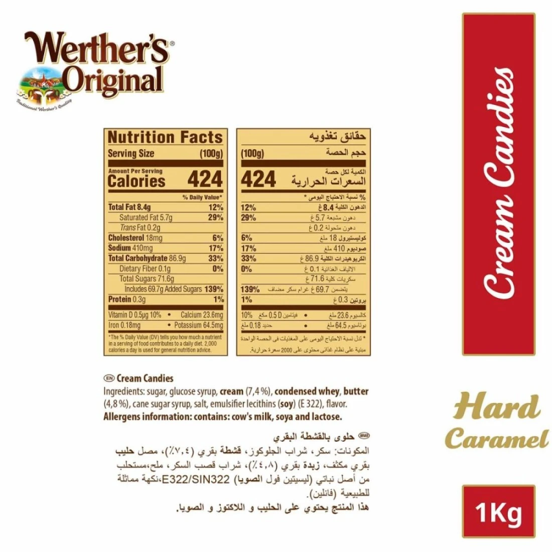 Werther's Original Cream Candy is a classic confection that has been loved by people for generations. Made with real butter and fresh cream these candies have a smooth and creamy texture that melts in your mouth. Each piece is individually wrapped making it perfect for sharing or enjoying on your own. With a rich and indulgent flavour, Werther's Original Cream Candy is perfect for satisfying your sweet tooth or as a delightful treat to give as a gift. This 1kg bag is great for stocking up and ensuring you always have plenty of these delectable candies on hand.