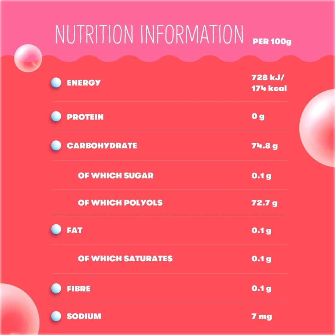 ingredients : Sweeteners (Maltitol (E965) (45%), Sorbitol (E420) (18.6%), Xylitol (E967) (5.1%), Maltitol Syrup (E965ii) (3.8%), Aspartame (E951) (0.16%), Acesulfame K (E950) (0.03%), Gum Base, Fruit Juices (Strawberry, Orange, Lemon)(3%), Flavours (Nature Identical Strawberry, Orange, Lemon and Vanilla)