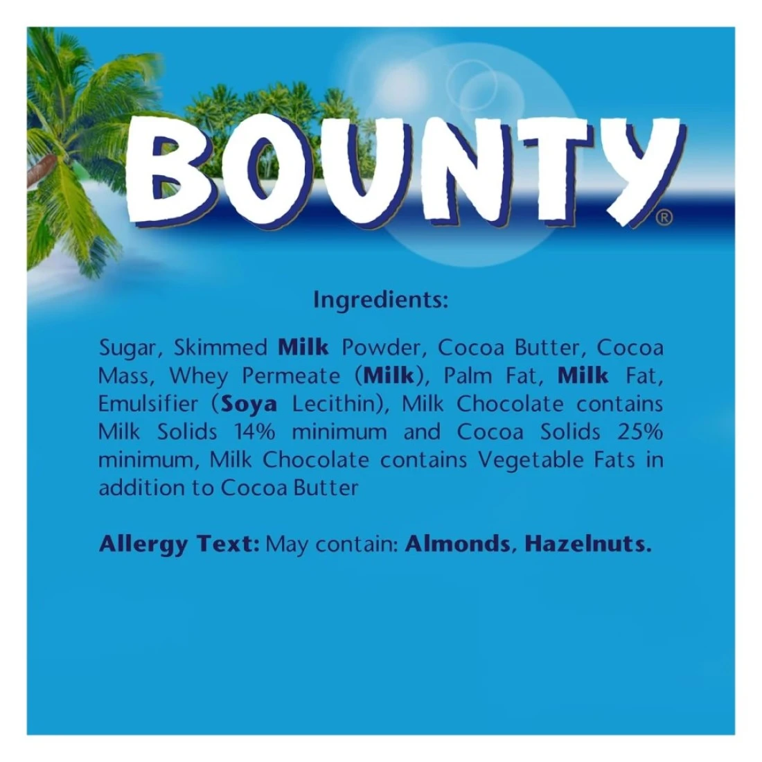 ingredients : Sugar, Skimmed Milk Powder, Cocoa Butter, Cocoa Mass, Whey Permeate (Milk), Palm Fat, Milk Fat, Emulsifier (Soya Lecithin), Milk Chocolate Contains Milk Solids 14% Minimum And Cocoa Solids 25% Minimum, Milk Chocolate Contains Vegetable Fats In Addition To Cocoa Butter