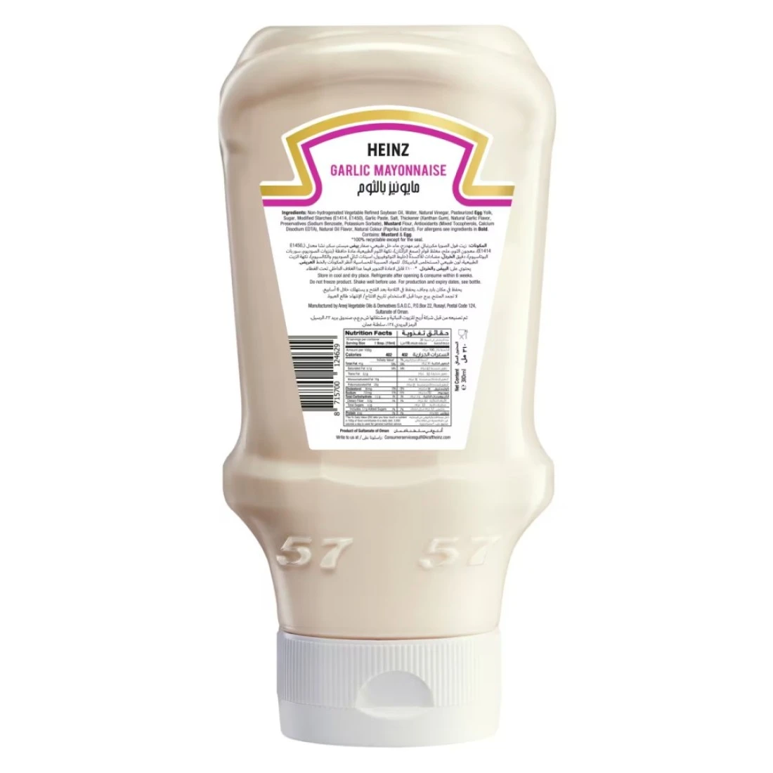 Heinz Mayonnaise Garlic 310ml is a creamy and flavourful condiment that adds a delicious twist to your favourite dishes. Made with real garlic this mayonnaise is perfect for spreading on sandwiches dipping fries or adding to dressings and sauces. Elevate your meals with the rich and aromatic taste of Heinz Mayonnaise Garlic 310ml. This creamy mayo is infused with the bold flavour of garlic giving your dishes a zesty kick. Whether you're making a garlic aioli or simply want to add a burst of flavour to your burgers and wraps this mayo is a must-have in your kitchen. If you're a garlic lover you'll love Heinz Mayonnaise Garlic 310ml. This smooth and creamy mayo is packed with the irresistible taste of garlic making it a versatile and delicious addition to your pantry. Whether you're using it as a dip dressing or spread this mayo will take your recipes to the next level with its bold and savoury flavour.