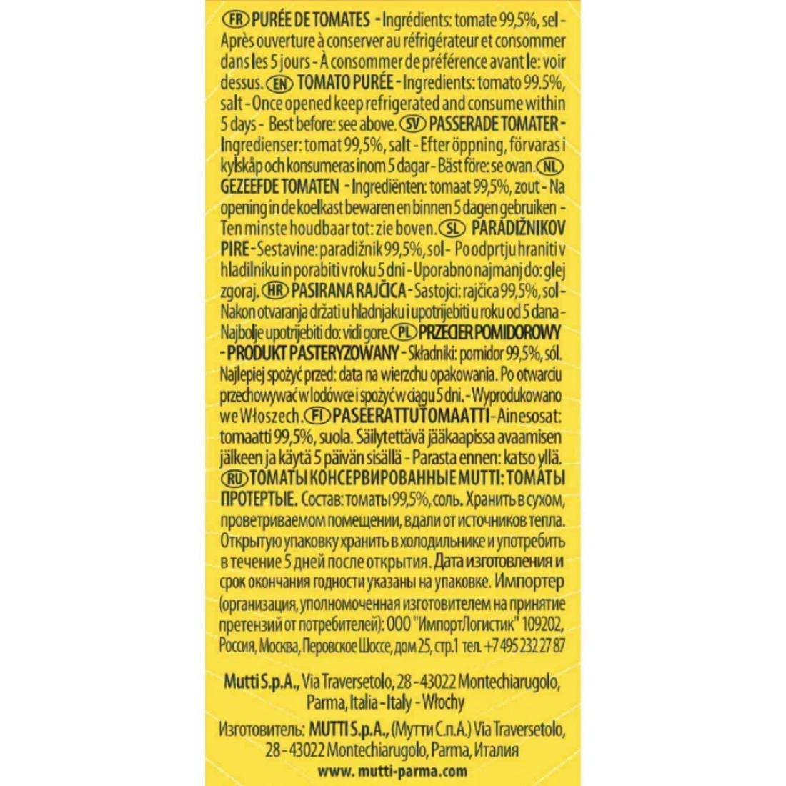 - Mutti Tomato Puree (Passata) is sun-ripened 100% Italian tomatoes transformed into a sweet velvety puree with just a touch of Mediterranean sea salt.