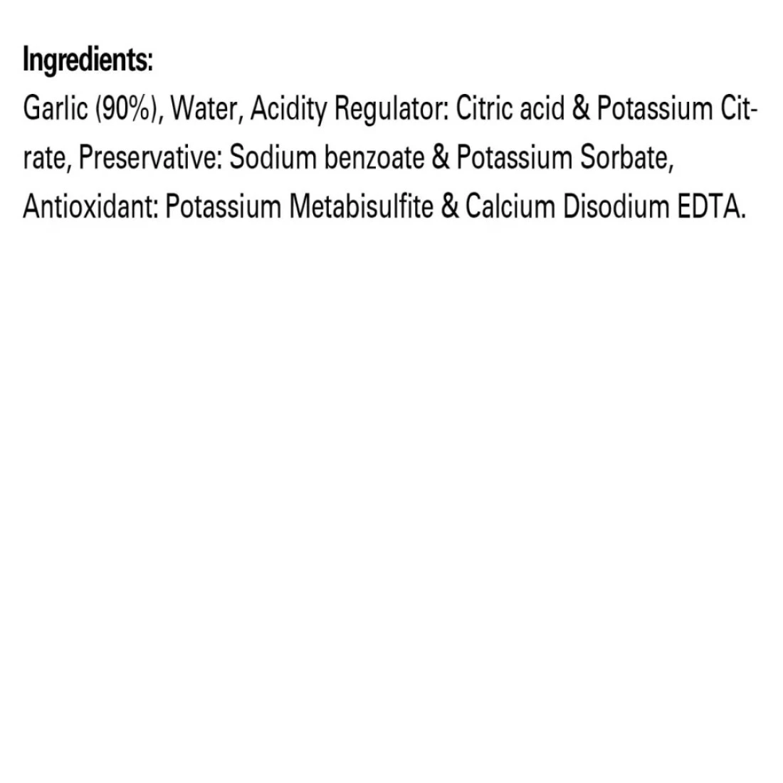 ingredients : Ginger, Garlic, Water, Citric Acid, Potassium Citrate, Preservative (Sodium Benzoate and Potassium Sorbate), Antioxidants (Potassium Metabisulphite and Calcium Disodium EDTA).