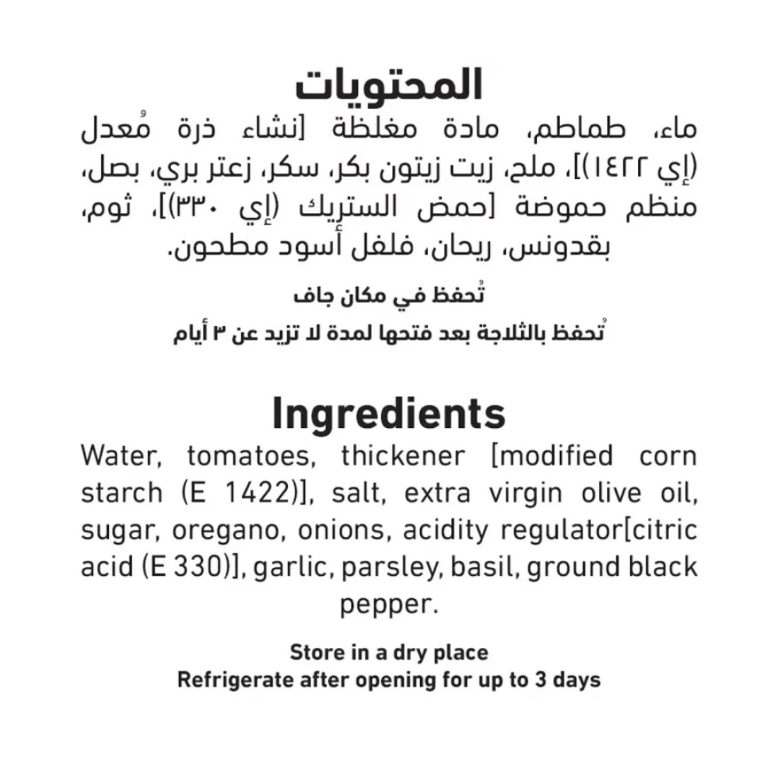 ingredients : Water, Tomatoes, Thickener, Salt, Olive Oil, Sugar, Oregano, Parsley, Garlic, Basil