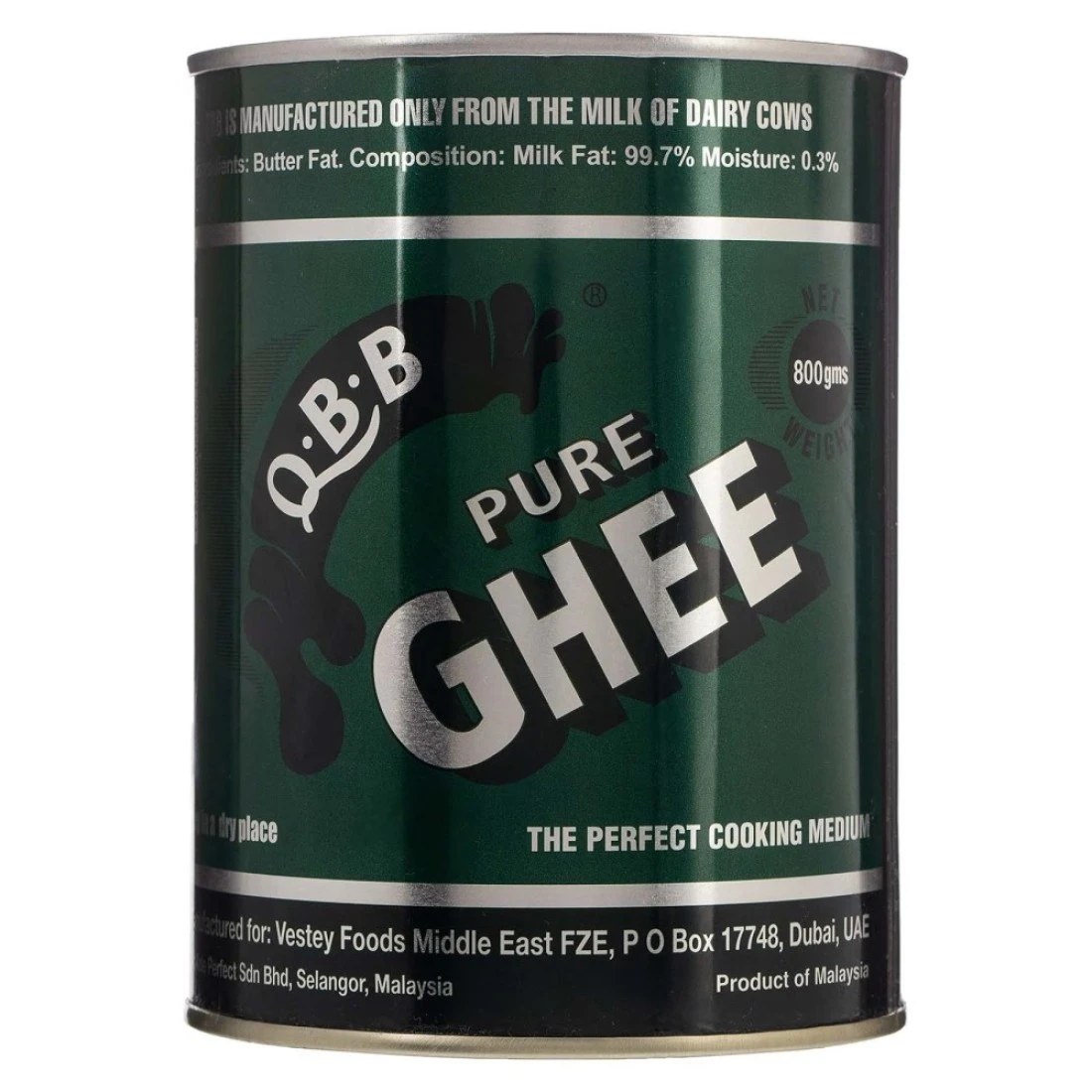 QBB Pure Ghee is a high-quality clarified butter that is widely used in Indian and Middle Eastern cuisine. It is made from the purest cow's milk which has been carefully churned and simmered to remove all impurities and moisture leaving behind a rich golden liquid. QBB Pure Ghee has a rich buttery flavour and a creamy texture that adds a delicious depth to any dish. It has a high-smoke point making it ideal for frying sautéing and baking. It also has a long shelf life thanks to its low moisture content. This 800ml jar of QBB Pure Ghee is perfect for chefs home cooks or anyone who appreciates the authentic taste and aroma of ghee. Its convenient size ensures you'll always have a plentiful supply of this versatile cooking ingredient on hand.