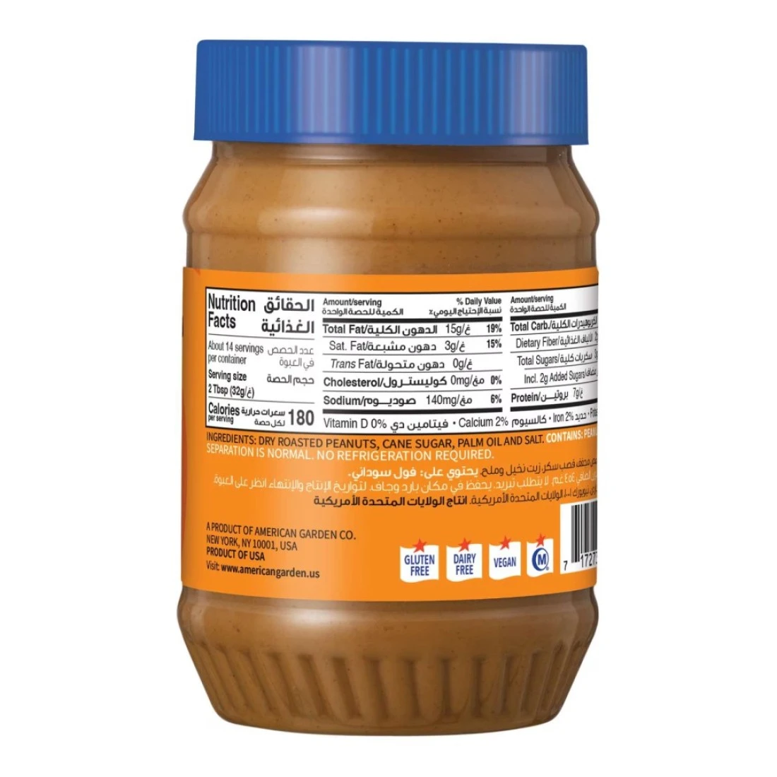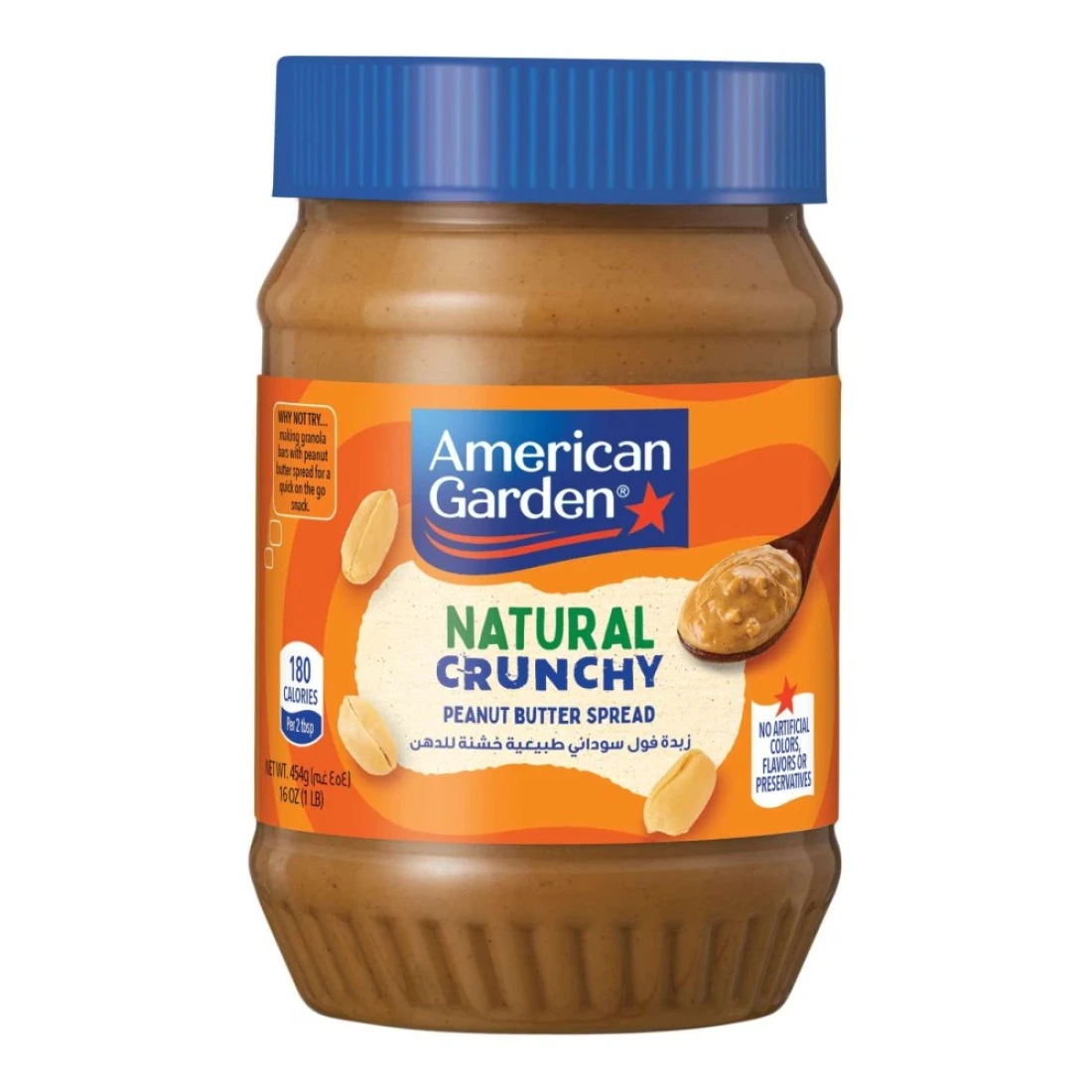 American Garden Natural Crunchy Peanut Butter 454g delivers a crunchy peanut butter taste made from natural and simple ingredients. No stirring is required easy to spread and is a delicious addition to all your favourite snacks. Perfect for shakes cookies or even as a dip for apples. This versatile peanut butter is packed with protein and fiber making it a great snack to enjoy post-workout at school in the office or at any time of the day. The possibilities are endless with this little jar. Contains no artificial colours or artificial flavours has no preservatives is gluten and dairy-free and is vegan. American Garden brings you premium quality foods from the United States and around the world. Our wide range of authentic foods is perfect for sharing with friends and family.