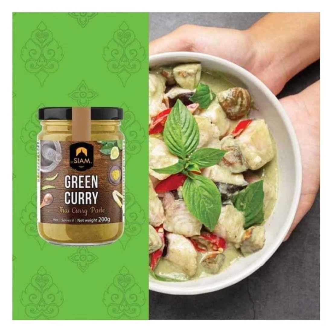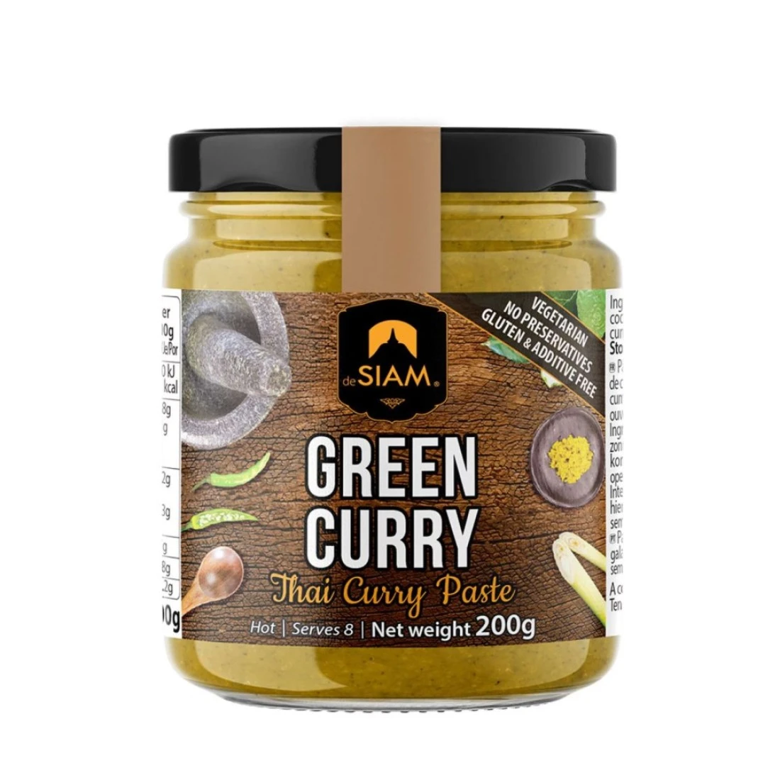 De Siam Green Curry Paste is a Thai cooking paste made from a blend of fresh green chilies lemongrass garlic shallots galangal and other traditional spices. This paste is known for its aromatic and vibrant flavours adding a kick to any dish it is used in. It is commonly used as a base for making Thai green curry but it can also be used to add a spicy and tangy flavour to stir-fries soups and marinades. The De Siam Green Curry Paste comes in a convenient 200g jar making it easy to store and use whenever needed.