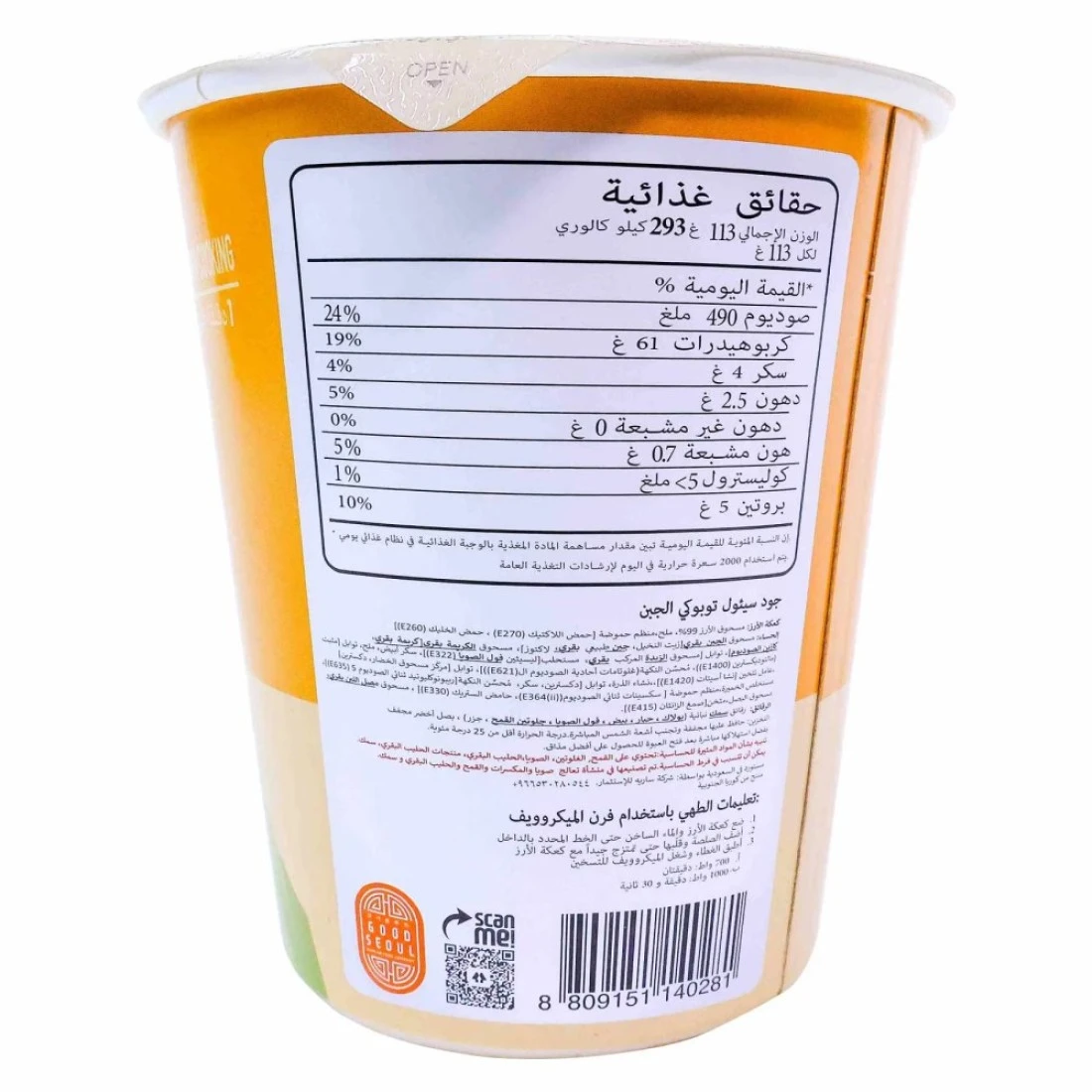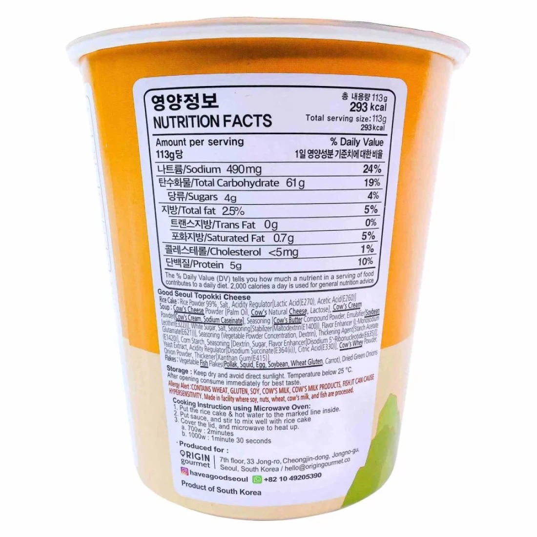 ingredients : Rice Powder 99%, Salt, Acidity Regulator [Lactic Acid(E270), Acetic Acid(E260)] Soup: Cow's Cheese Powder [Palm Oil, Cow's Natural Cheese, Lactose), Cow's Cream Powder Cow's Cream, Sodium Caseinate], Seasoning [Cow's Butter Compound Powder, Emulsifier Soybean Lecithin (E322), White Sugar, Salt, Seasoning [Stabilizer (Maltodextrin (E1400)), Flavour Enhancer (L-Monosodium Glutamate (E621))], Seasoning (Vegetable Powder Concentration, Dextrin), Thickening Agent[Starch Acetate (E1420), Corn Starch, Seasoning [Dextrin, Sugar, Flavour Enhancer [Disodium 5'-Ribonucleotide (E635) Yeast Extract, Acidity Regulator [Disodium Succinate (E364 (ii)), Citric Acid(E330)], Cow's Whey Powder Flakes: Vegetable Fish Flakes (Pollak, Squid, Egg, Soybean, Wheat Gluten, Carrot), Dried Green Onions.