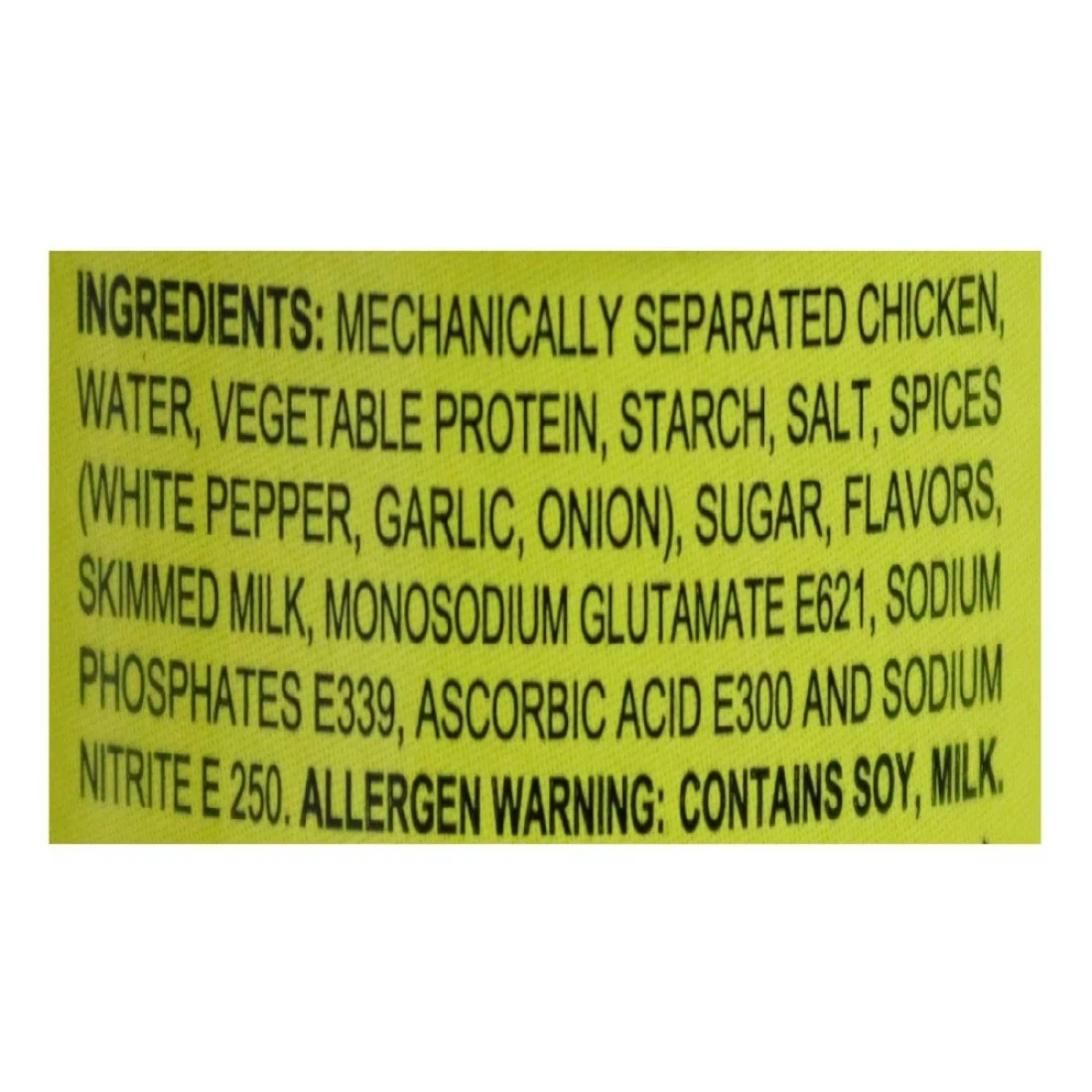 ingredients : Mechanically Separated Chicken, Water, Vegetable Protein, Starch, Salt, Spices (White Pepper, Garlic, Onion), Sugar, Flavors, Skimmed Milk, Monosodium Glutamate E621, Sodium Phosphates E339, Ascorbic Acid E300 And Sodium Nitrite E250