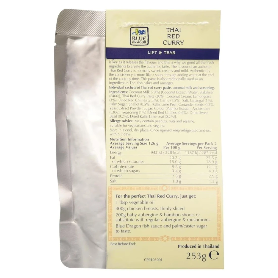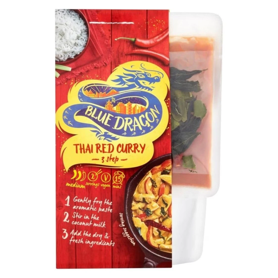 Blue Dragon 3 Step Thai Red Curry is a convenient and easy-to-use meal kit that allows you to make authentic Thai Red Curry at home in just 3 simple steps. This kit contains a paste, coconut milk, and herbs for a delicious and flavourful curry dish.