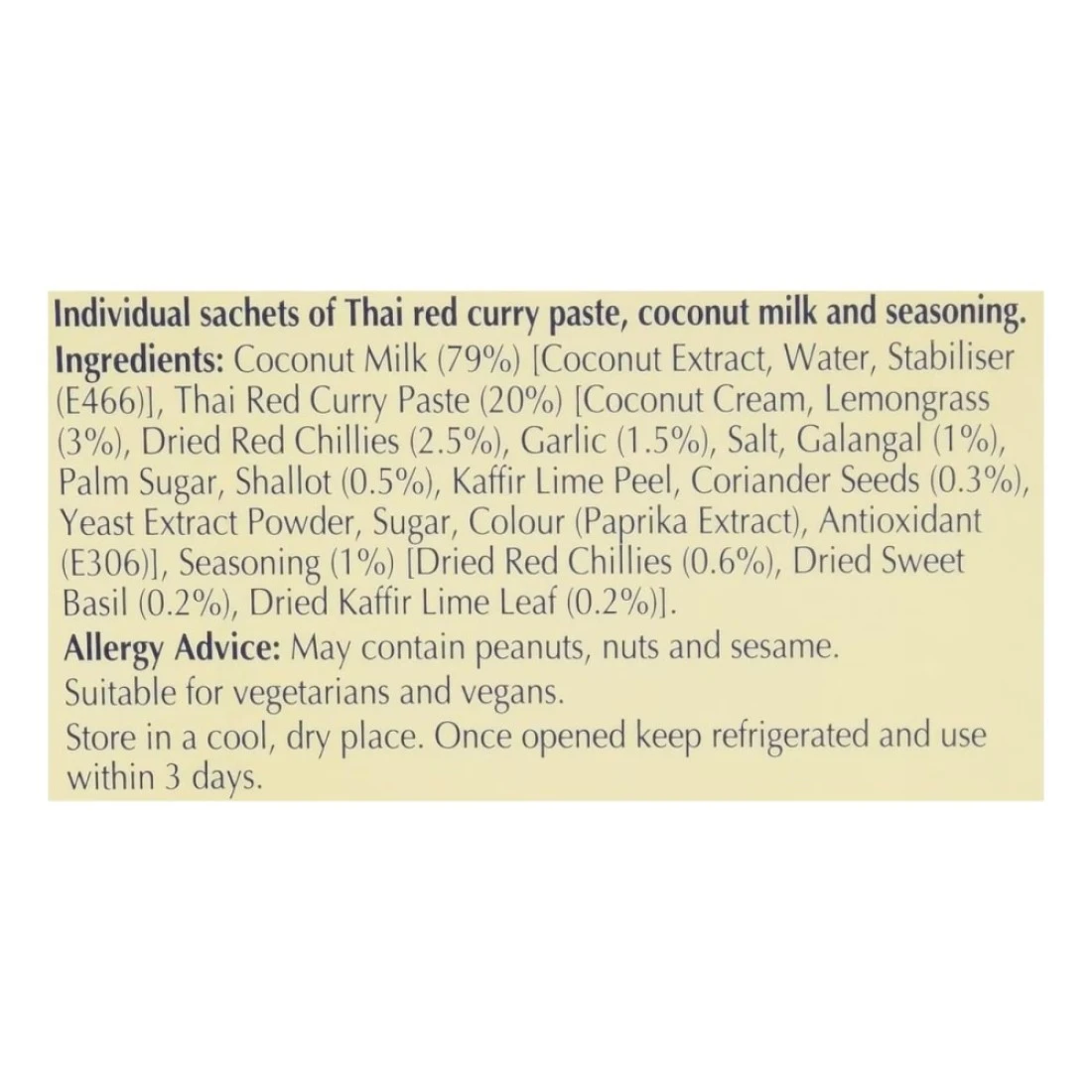 ingredients : Coconut Milk (79%) [Coconut Extract, Water, Stabiliser (E466)], Thai Red Curry Paste (20%) [Coconut Cream, Lemongrass (3%), Dried Red Chillies (2.5%), Garlic (1.5%), Salt, Galangal (1%), Palm Sugar, Shallot (0.5%), Kaffir Lime Peel, Coriander Seeds (0.3%), Yeast Extract Powder, Sugar, Colour (Paprika Extract), Antioxidant (E306)], Seasoning (1%) [Dried Red Chillies (0.6%), Dried Sweet Basil (0.2%), Dried Kaffir Lime Leaf (0.2%)]