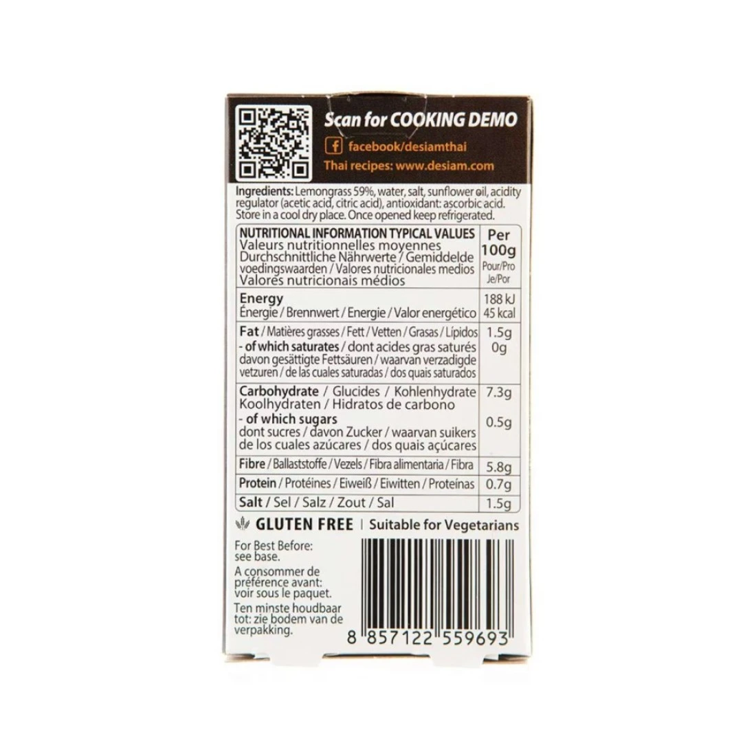 De Siam Lemongrass Stir Fry Paste is a fragrant and versatile paste that can be used to add a burst of flavour to a variety of dishes. Made with lemongrass chili garlic and other aromatic spices this paste brings a distinctly Thai taste to any stir fry or curry. It is easy to use simply fry with oil and add your choice of meat vegetables or tofu for a quick and delicious meal. With its zesty and tangy flavour De Siam Lemongrass Stir Fry Paste is a must-have pantry staple for any lover of Thai cuisine.