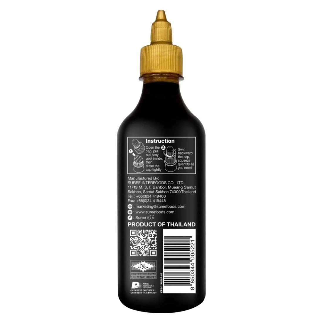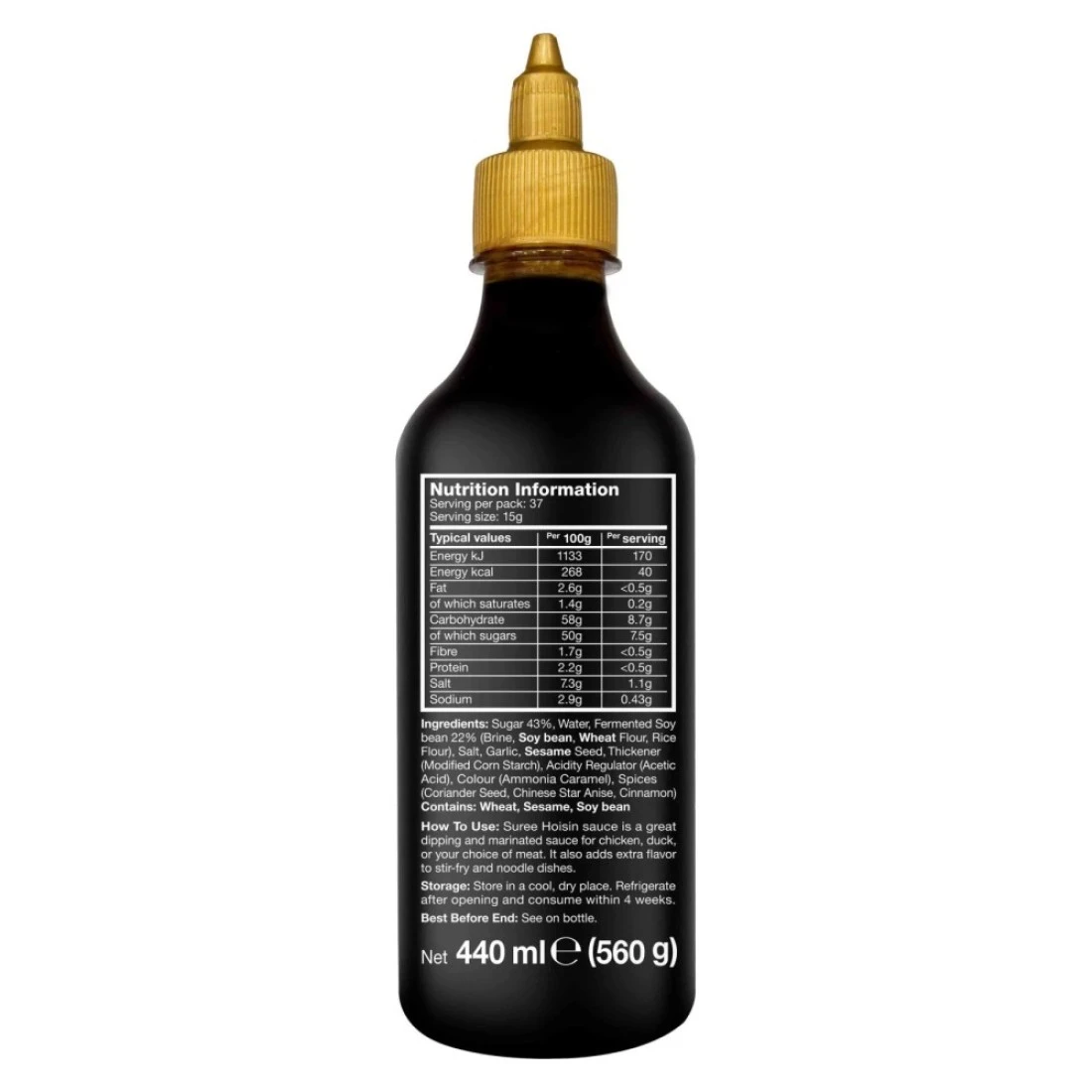 ingredients : Sugar (43%), Water (23%), Fermented Soy Bean (22%), Salt (5%), Garlic (3%), Sesame Seed (2%), Thickener (Modified Corn Starch) (1%), Acidity Regulator (Acetic Acid) (0.50%), Natural Colour (Caramel E150c) (0.30%), Spices (Coriander Seed, Chinese Star Anise, Cinnamon) (0.2%).