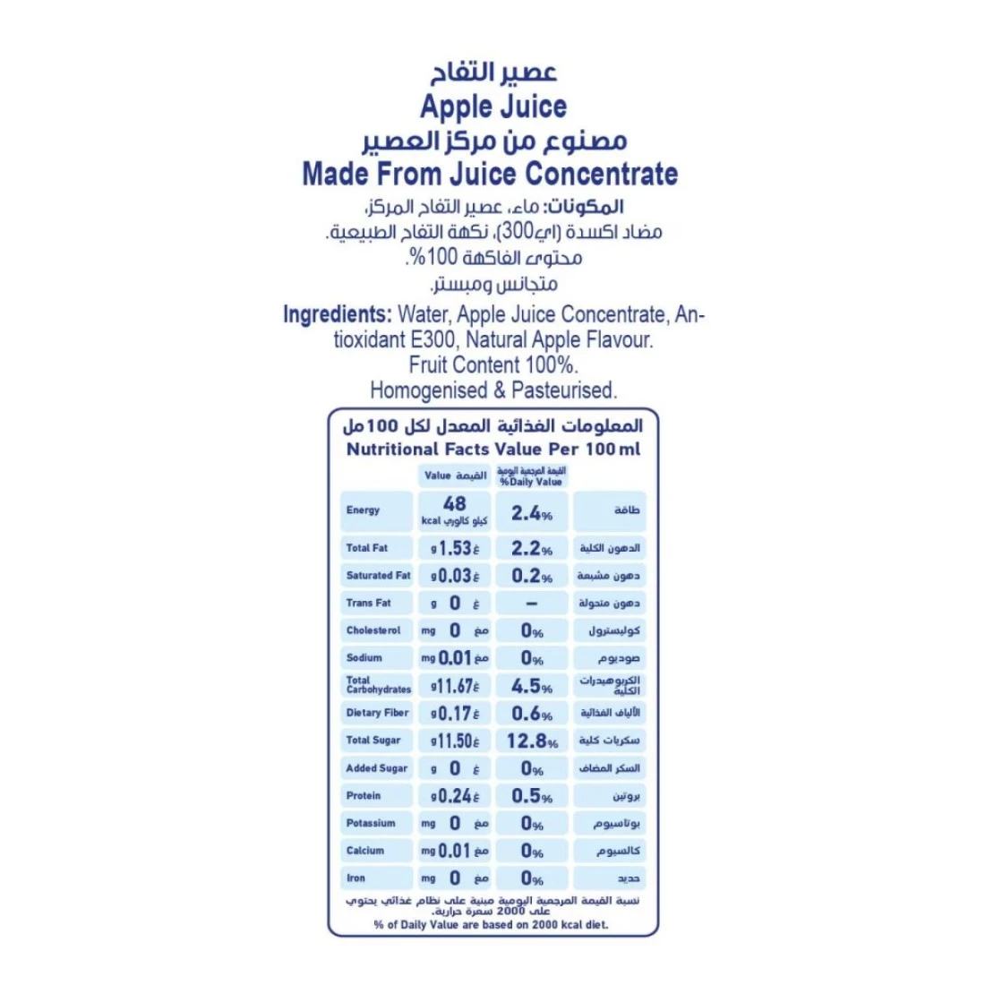 ingredients : Water, Apple Juice Concentrate (100%), Ascorbic Acid (Vit V) Natural Apple Flavour