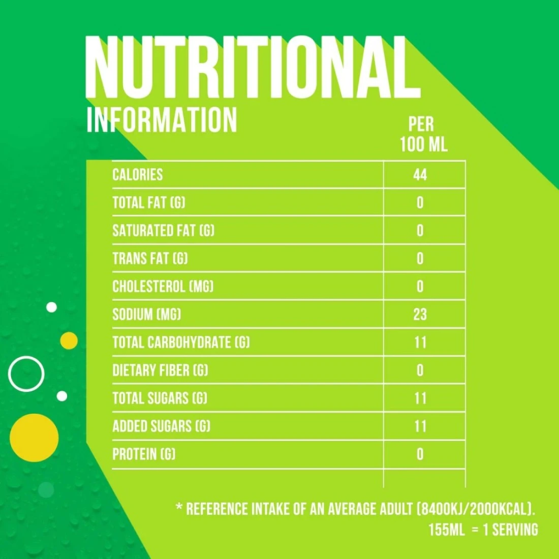 ingredients : Carbonated beverage containing: Carbonated Water, Sugar, Acidulants(citric acid, malic acid), acidity regulator (sodium citrate), preservatives (sodium benzoate, potassium sorbate), Natural Citrus Flavour, Sweeteners (steviol glycoside 111mg/L, acesulfame potassium 52 mg/L, sucralose 19 mg/L)
