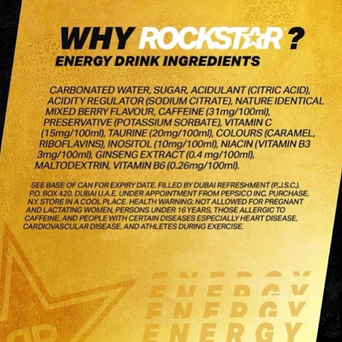 ingredients : Carbonated Water, Sugar, Acidulant (Citric Acid), Acidity Regulator (Sodium Citrate), Nature Identical Mixed Berry Flavour, Caffeine (31mg/100ml), Preservative (Potassium Sorbate), Vitamin C (15mg/100ml), Taurine (20mg/100ml), Colours (Caramel Riboflavins), Inositol (10mg/100ml), Niacin (Vitamin B3 3mg/100ml), Ginseng Extract (0 4 Mg/100ml), Maltodextrin, Vitamin B6 (0 26mg/100ml)