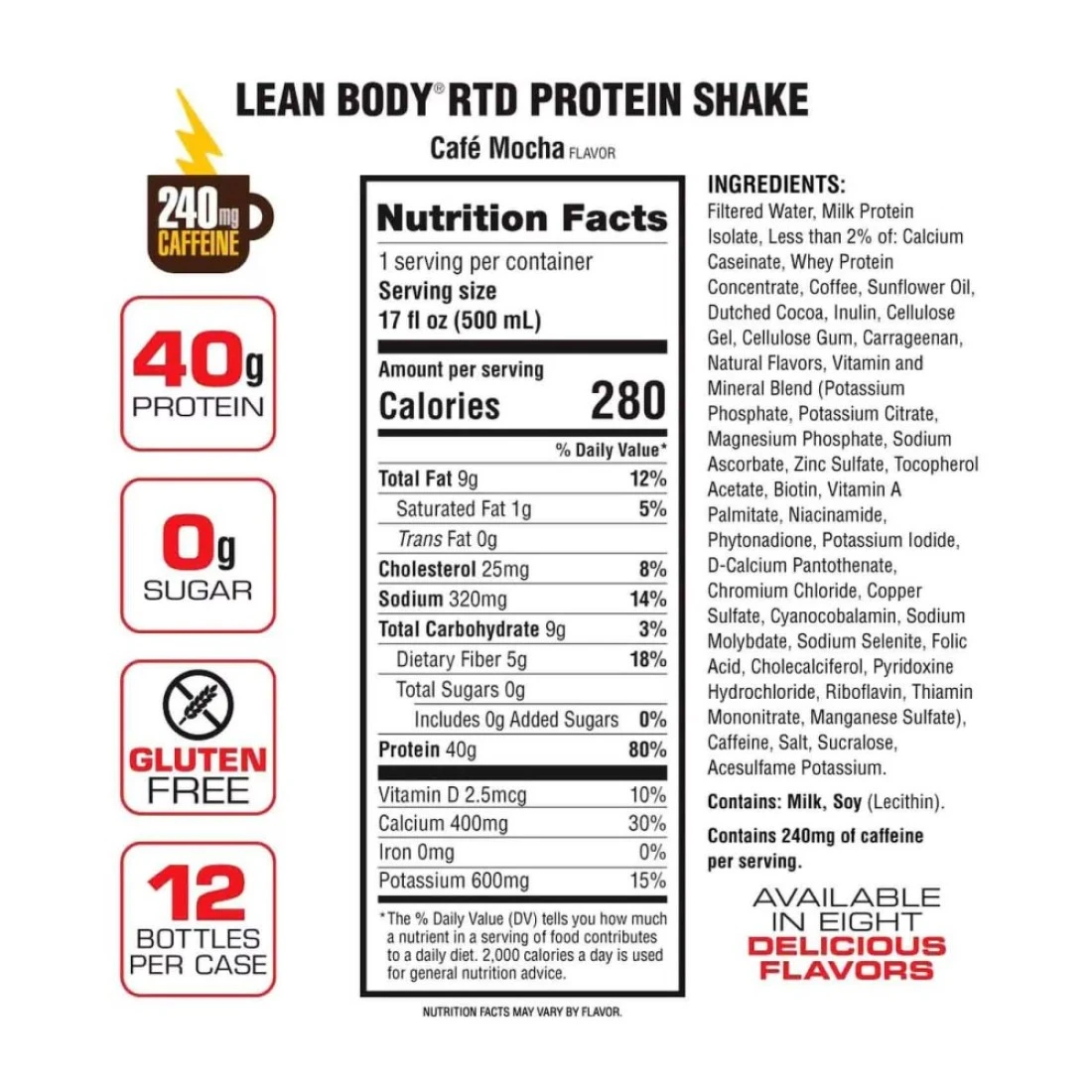 ingredients : Filtered Water, Lean Pro (Special Blend of Spray Dried Ultrafiltered Milk Protein Isolate, Yielding Fast-Acting Whey Protein Peptides, Branched Chain Amino Acids, L-Glutamine Peptides, and Slow Acting Casein Peptides, Whey Protein Concentrate, Calcium Caseinate), Coffee, Sunflower Oil, Fiberplex (Fructooligosaccharides, Cellulose Gel, Cellulose Gum, Xanthan Gum, Carrageenan), Soy Lecithin, Cocoa Processed with Alkali, Natural Flavours, Vitamin and Mineral Blend (Potassium Citrate and Sodium).