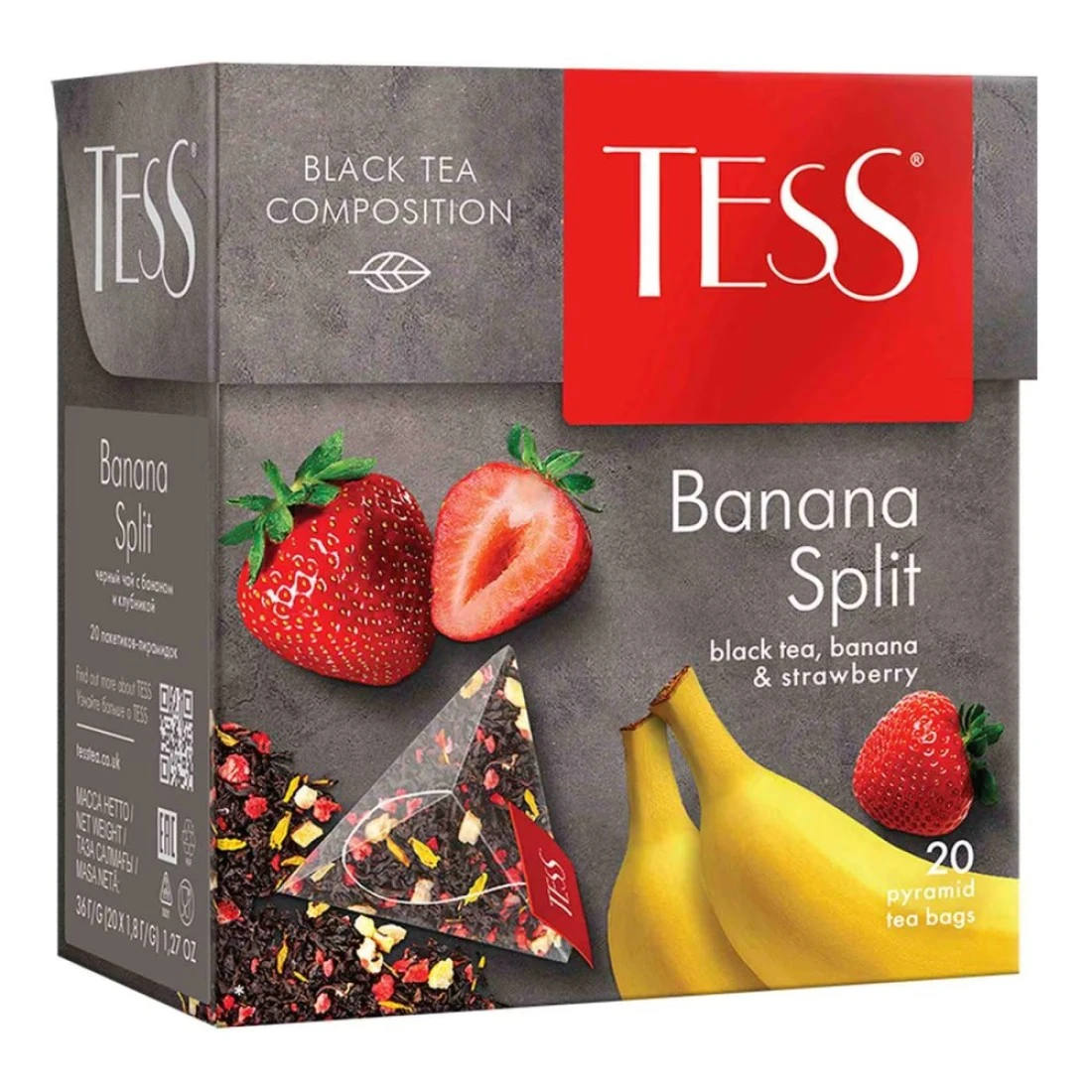 Tess Banana Split Black Tea is a delicious blend of black tea with the flavours of banana and strawberry. Each box contains 20 tea bags, perfect for enjoying a sweet and fruity tea experience.
