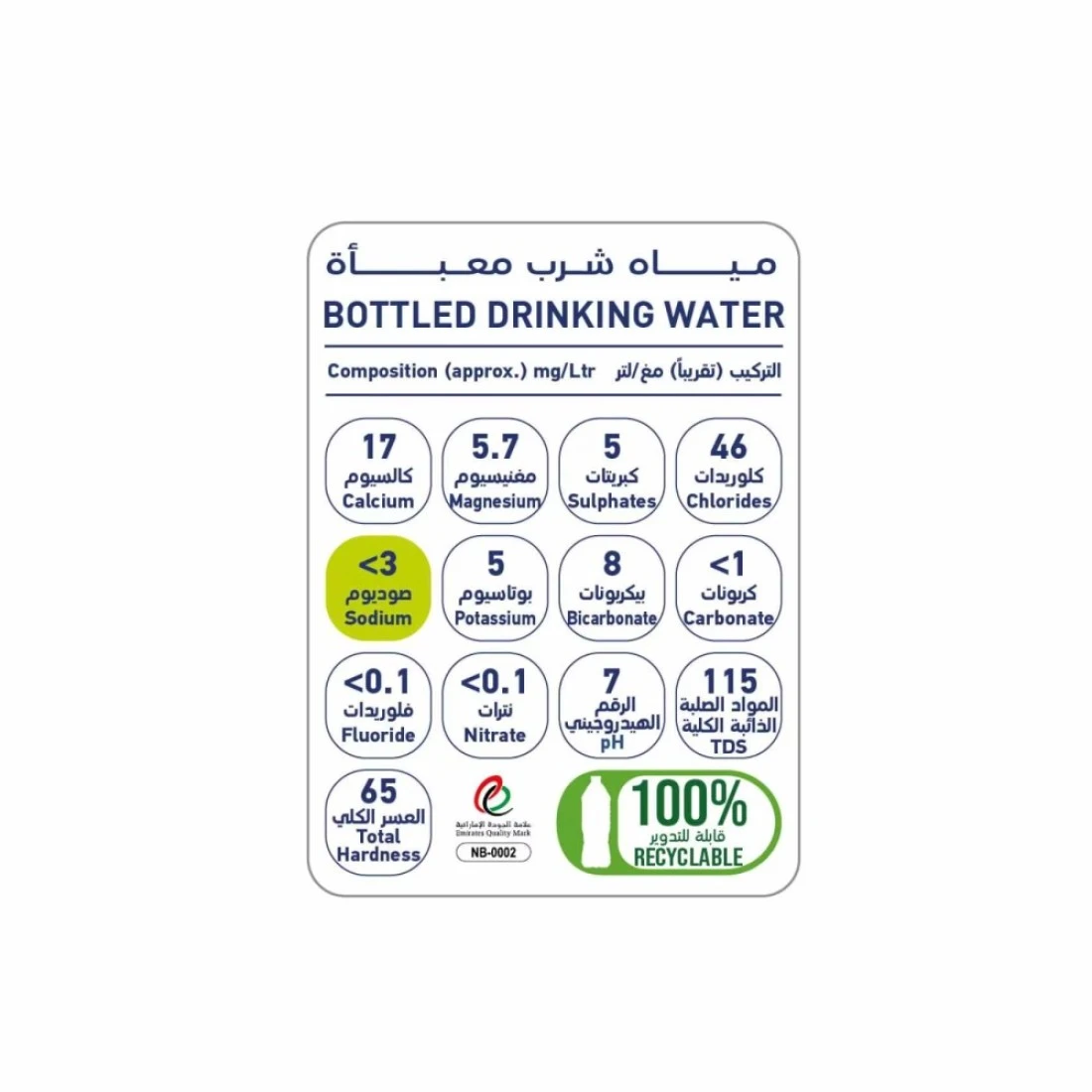 ingredients : Calcium 19.5mg/L, Magnesium 6.5mg/L, Sulphates 6mg/L, Chlorides 50mg/L, Sodium 8mg/L, Potassium 5mg/L, Bicarbonate 38mg/L, Carbonate <1mg/L, Fluoride <0.1mg/L, Nitrate <0.1mg/L, pH 4.5mg/L, TDS 120mg/L, Total Hardness 68mg/L, Calories 0kcal/L