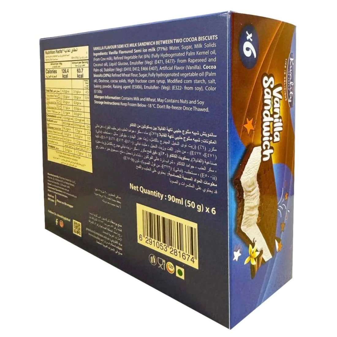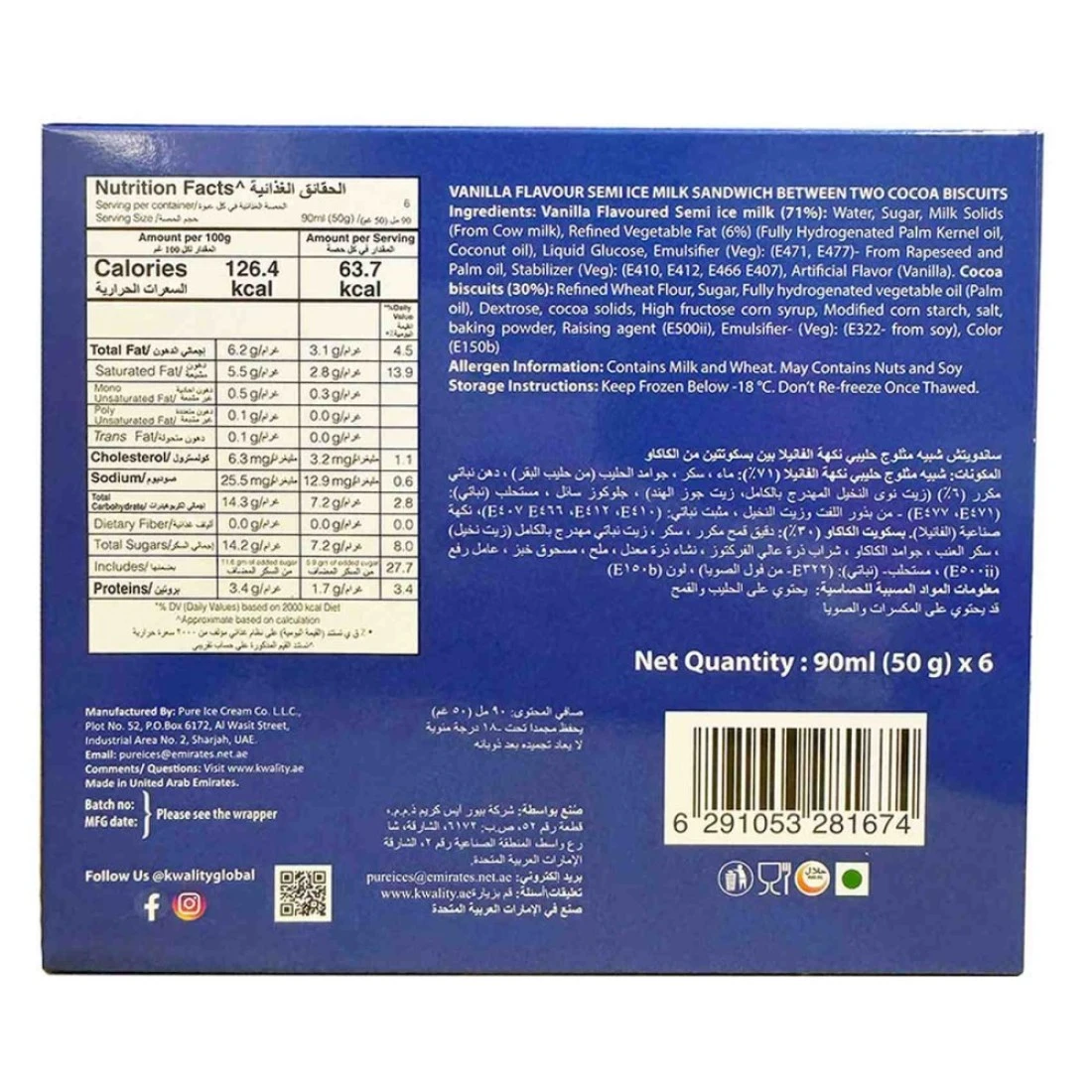 Indulge in the creamy delight of Kwality Vanilla Sandwich Ice Cream, available in a convenient pack of 6 x 90ml. Each sandwich features rich, smooth vanilla ice cream nestled between two soft, delicious wafers, making it the perfect treat for any occasion. Ideal for sharing or enjoying on your own, this classic dessert offers a refreshing taste that satisfies your sweet cravings. Perfectly portioned and easy to grab, Kwality Vanilla Sandwich Ice Cream is a delightful addition to your freezer, ready to bring joy to every moment.