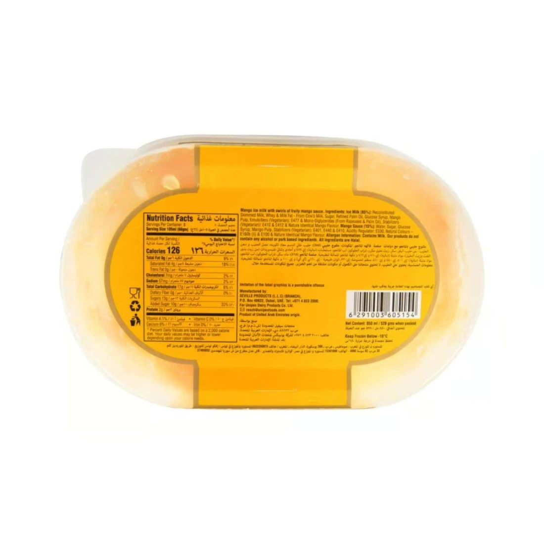 ingredients : Mango Ice Milk With Swirls Of Fruity Mango Sauce, Ingredients: Ice Milk (85%): Reconstituted Skimmed Milk, Whey & Milk Fat - From Cow's Milk, Sugar, Refined Palm Oil, Glucose Syrup, Mango Pulp, Emulsifiers (Vegetarian): E477 & Mono-diglycerides (Farm Rapeseed & Palm Oil), Stabilizers (Vegetarian: E410 & E412 & Nature Identical Mango Flavour Mango Sauce (15%): Water, Sugar, Glucose Syrup, Mango Pulp, Stabilizers (Vegetarian): E401, E440 & E410, Acidity Regulator: E330, Natural Colours- E1600 (ii) & E100 & Nature Identical Mango Flavour