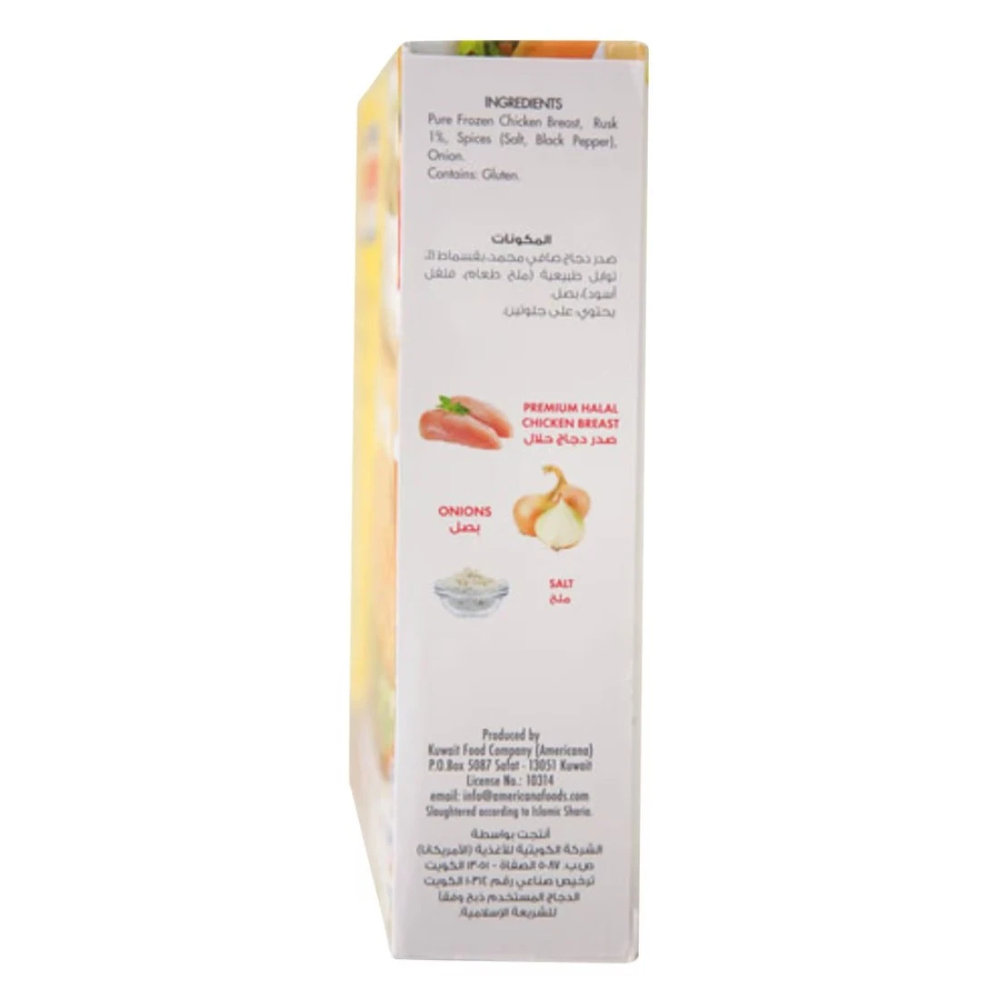 ingredients : Pure Frozen Chicken Breast, Rusk 1%, Spices (Salt, Black Pepper), Onion